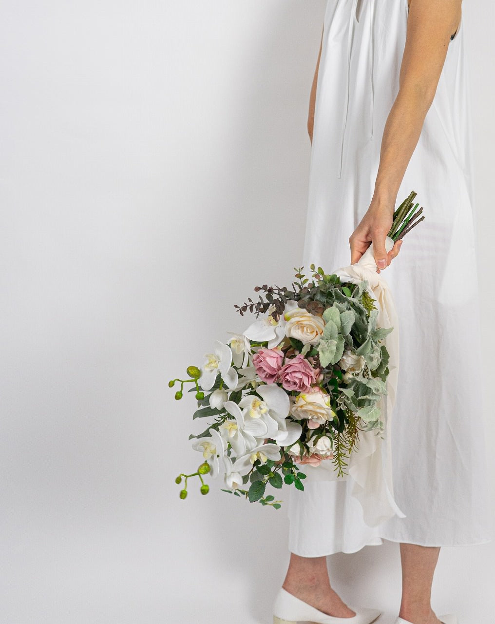 コチョウランの持つ存在感とエレガントな揺れは新婦様だけの贅沢。上品でラグジュアリーな仕上がり。
