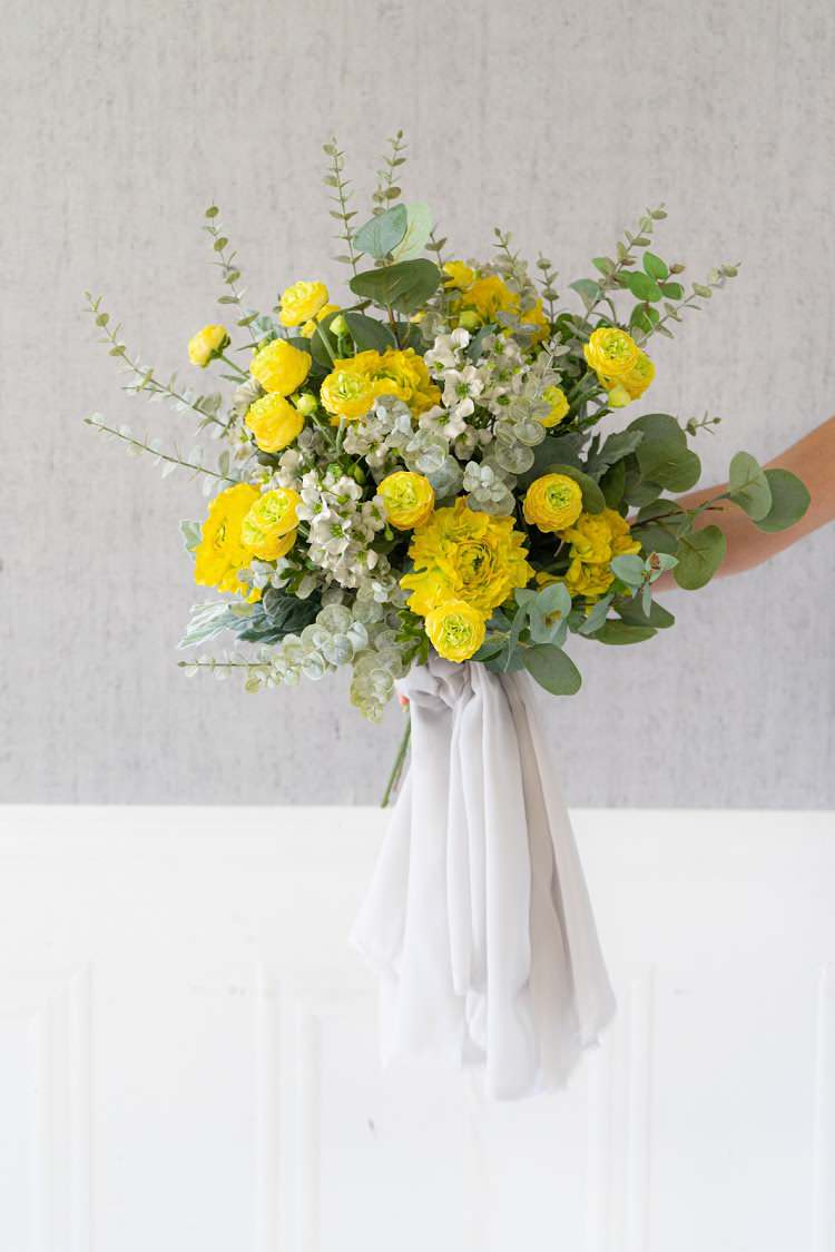 ふんわり可愛らしいラナンキュラスを使ったイエローのクラッチブーケ。