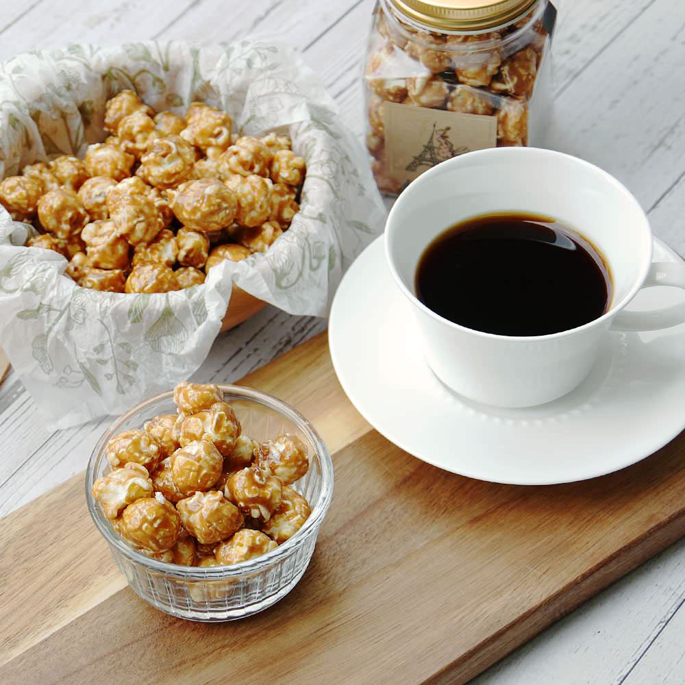 フランス産のキャラメルペーストをたっぷり絡めた濃厚な味わいと、サクサク食感がクセになるフレーバーポップコーン♪