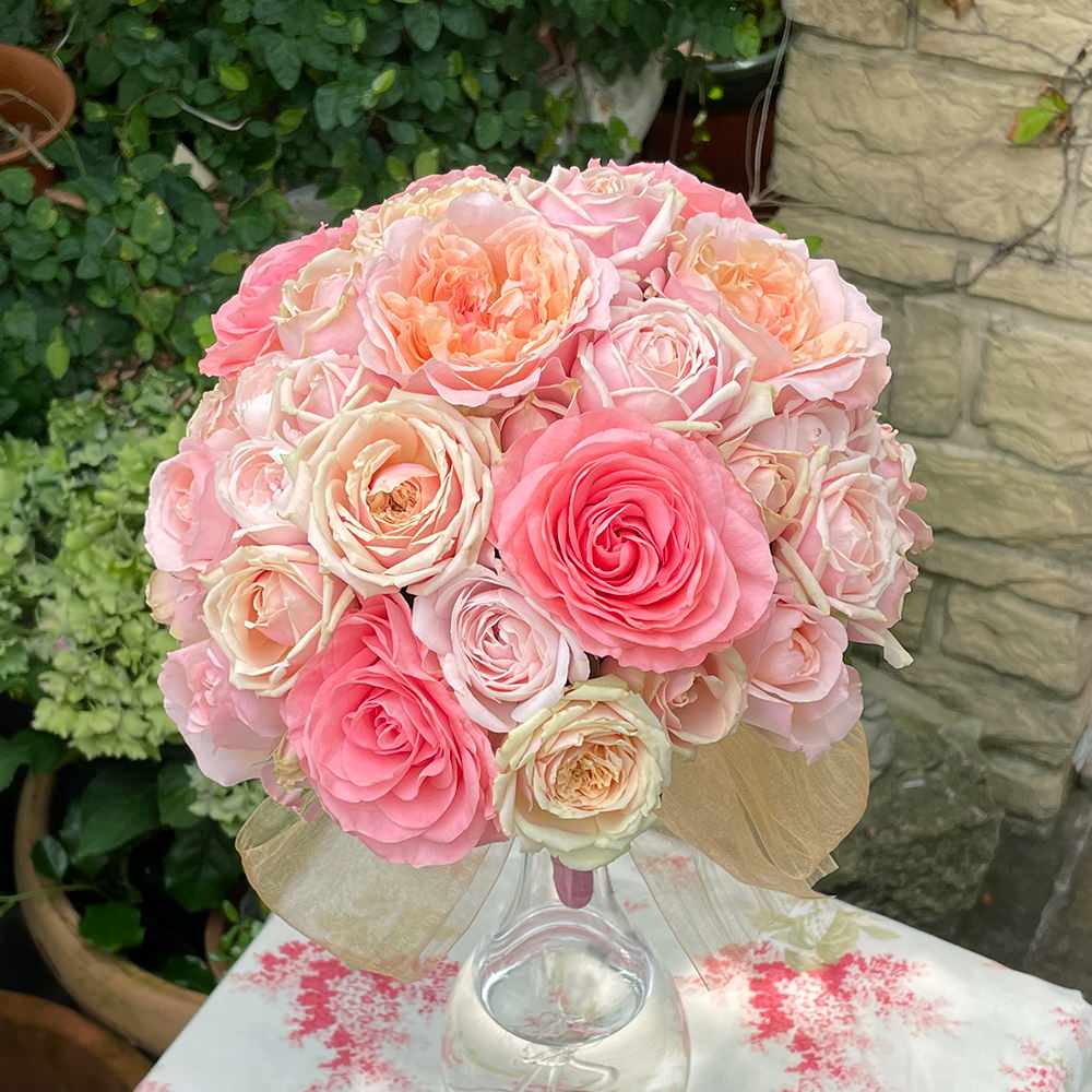 さまざまなピンクのバラを束ねたラウンドブーケです。甘いピンクにベージュピンクを重ねた大人可愛い色合いです。