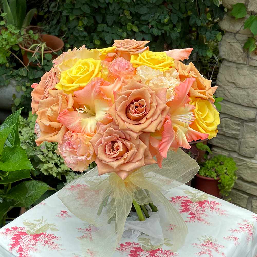シックなオレンジとイエローが幻想的なクラッチブーケです。
