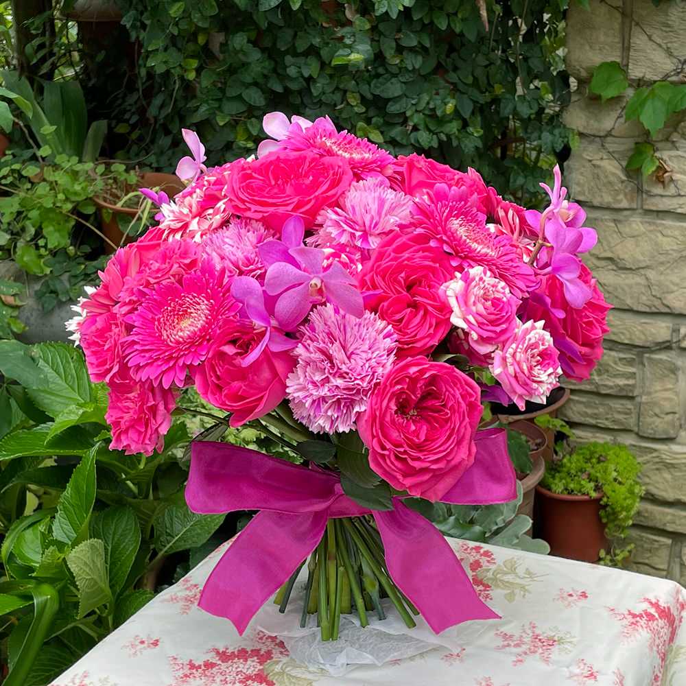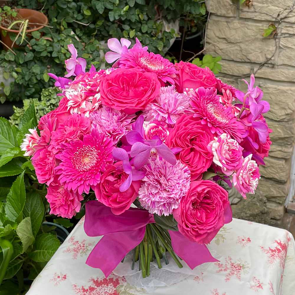 ビビットピンクを集めたクラッチブーケです。喜びが咲きあふれるような鮮やかさ。