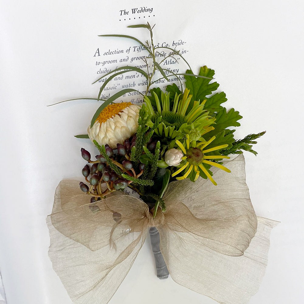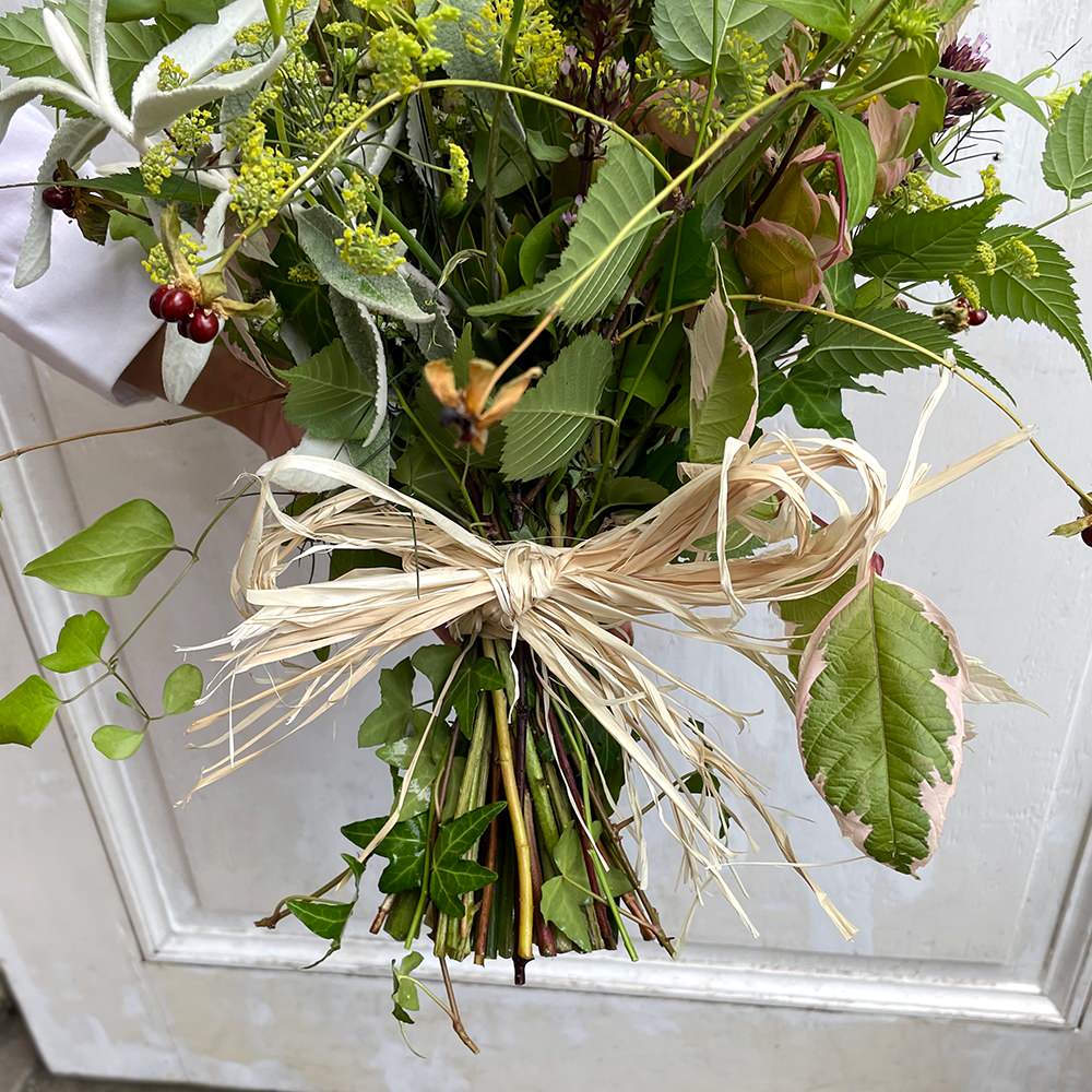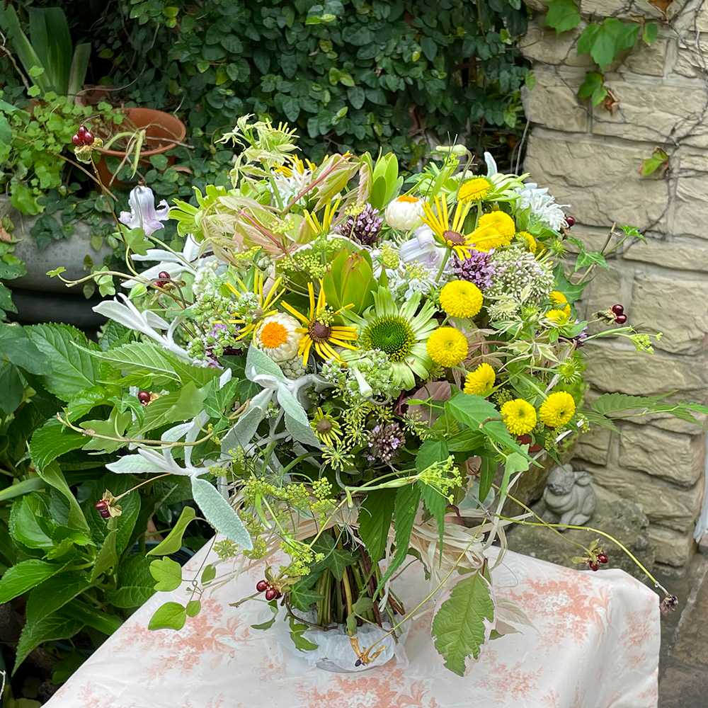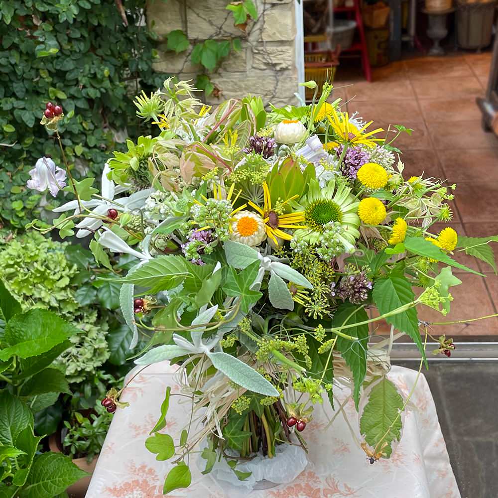 イエロー&グリーンをメインに草花をあふれるように束ねました。写真は参考イメージです。季節の草花を使ってデザインします。