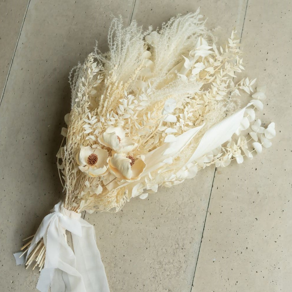 脱色加工により、あえて花の色みを消した真っ白なブーケ。