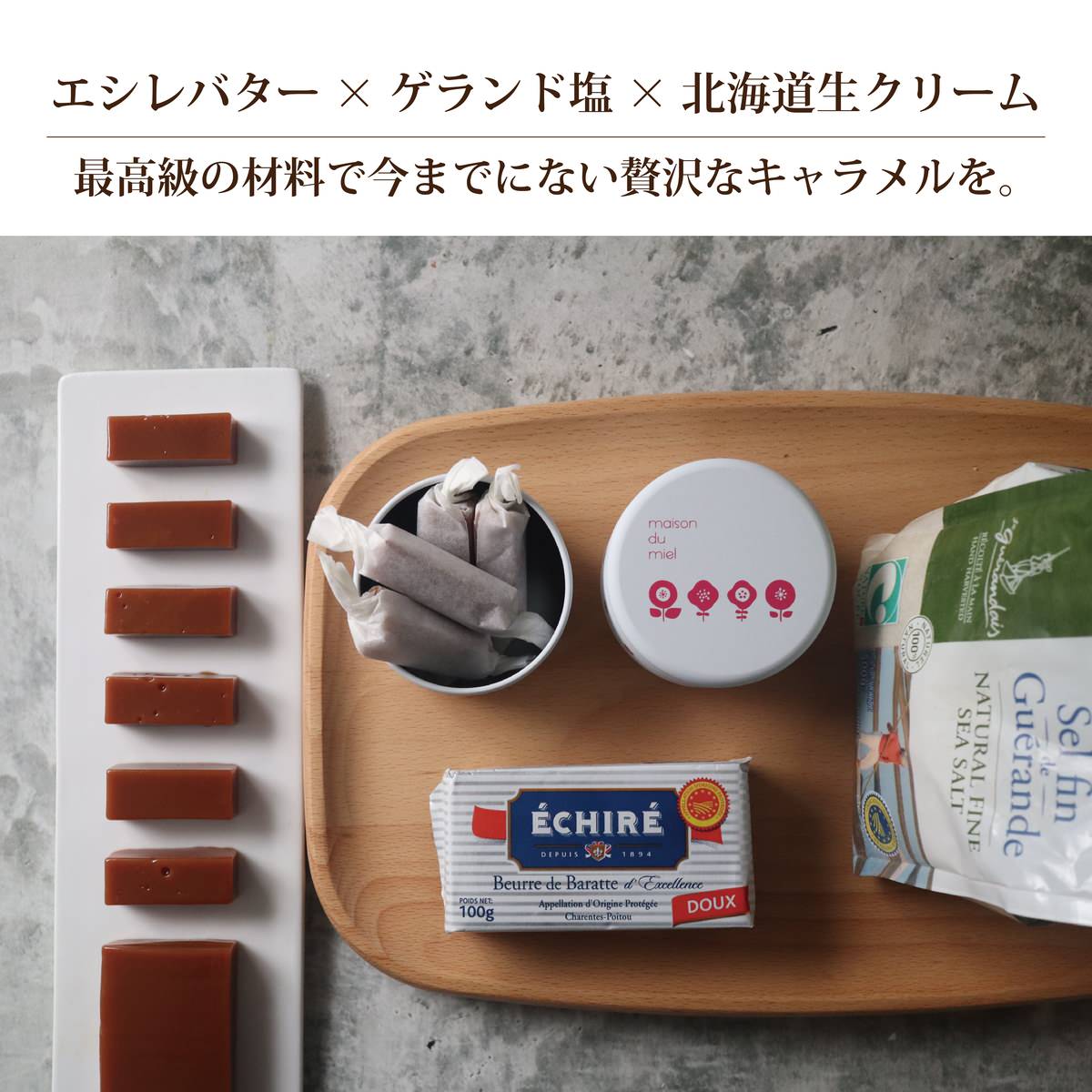 エシレバター×ゲランド塩×北海道生クリームを組み合わせた、最高級の材料で今までにない贅沢なキャラメルをどうぞお楽しみください。