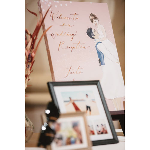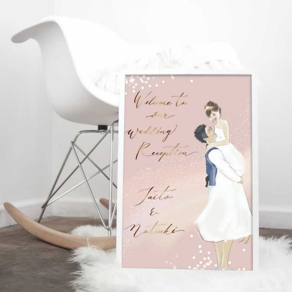 幸せな2人のオリジナルイラスト入りウェルカムボードで、結婚式や二次会に参加していただく大事なゲストの方々を温かくお迎えするお手伝いを致します。