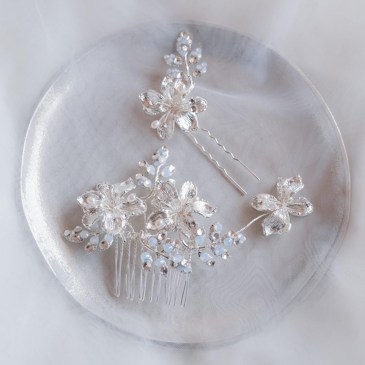 ・シルバーフラワーとリーフが特徴のヘッドドレス