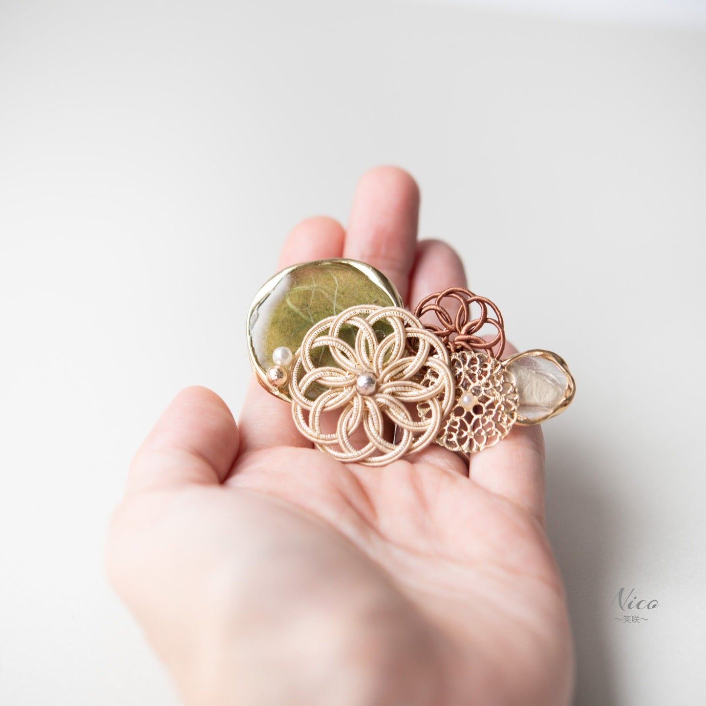 こちらの、【水引ヘアクリップ 透かし花躍る 五箇山和紙 抹茶×ベージュ】は、抹茶色・ベージュ・淡茶色・白の少し渋め大人レトロカラーが特徴です。