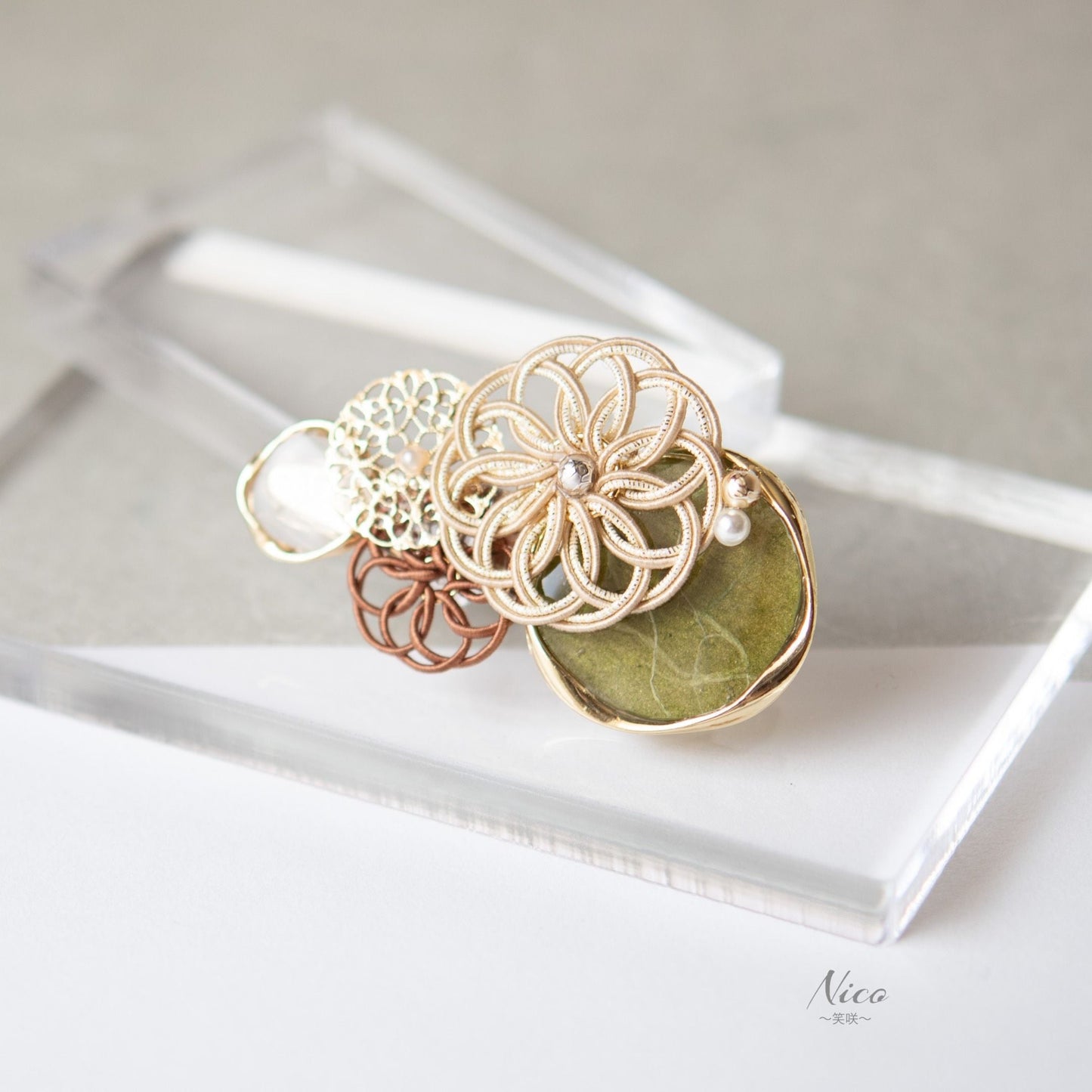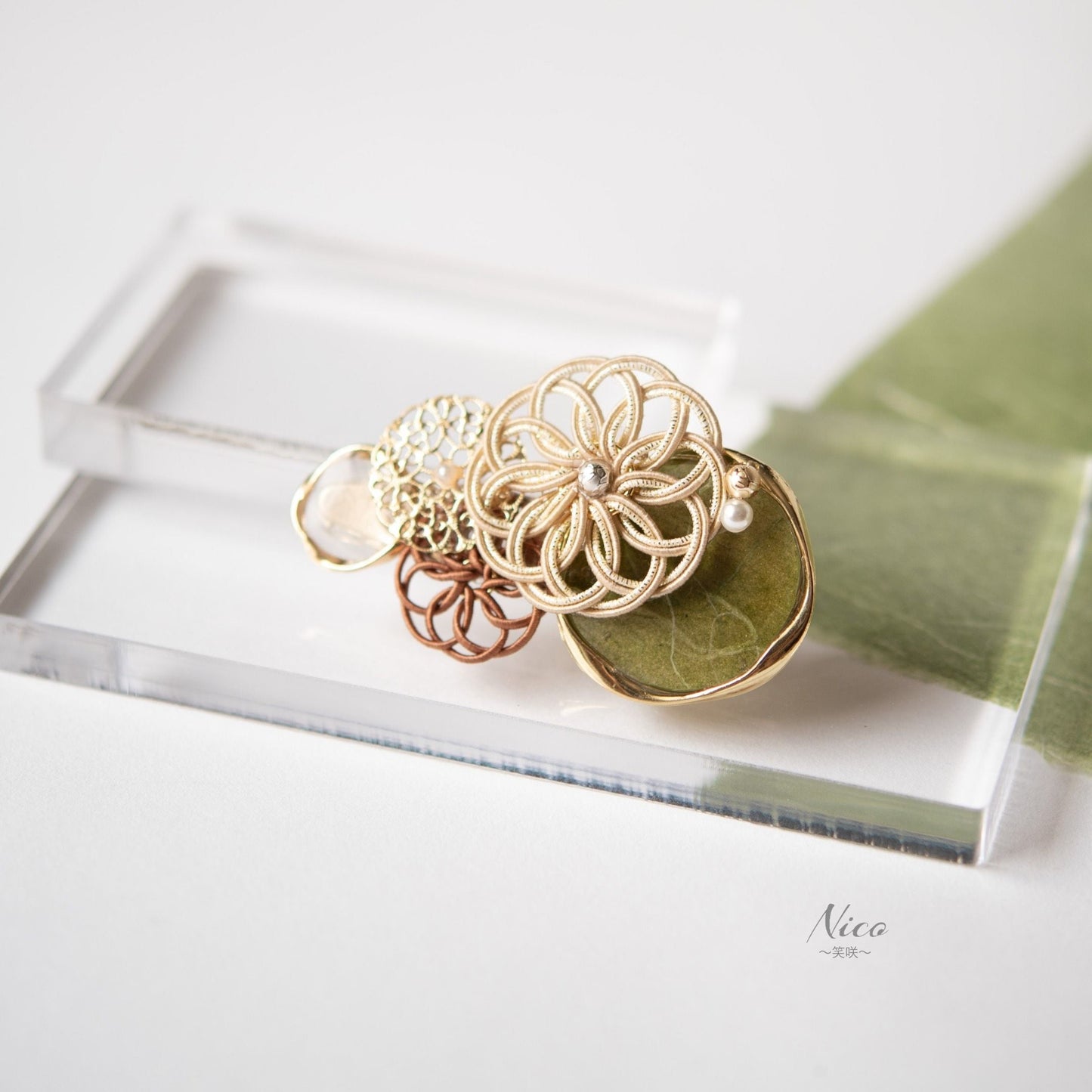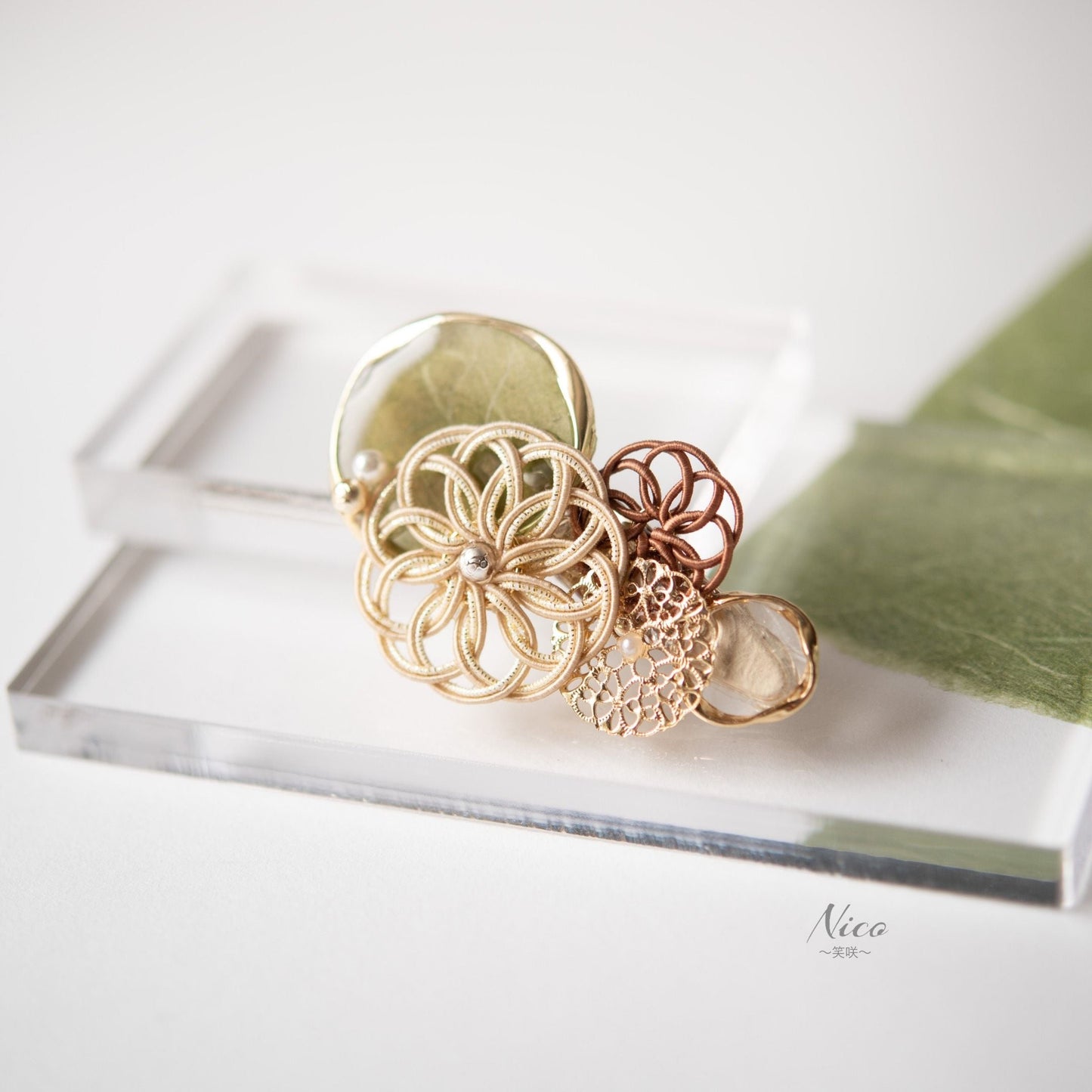 水引ヘアクリップ 透かし花躍る 五箇山和紙 抹茶×ベージュ