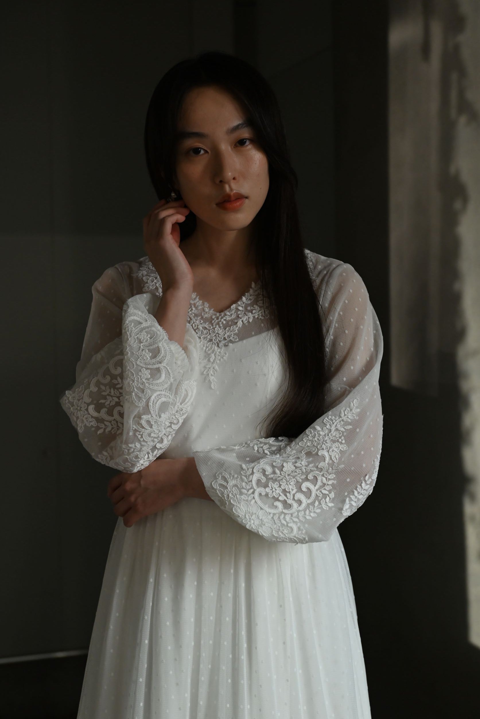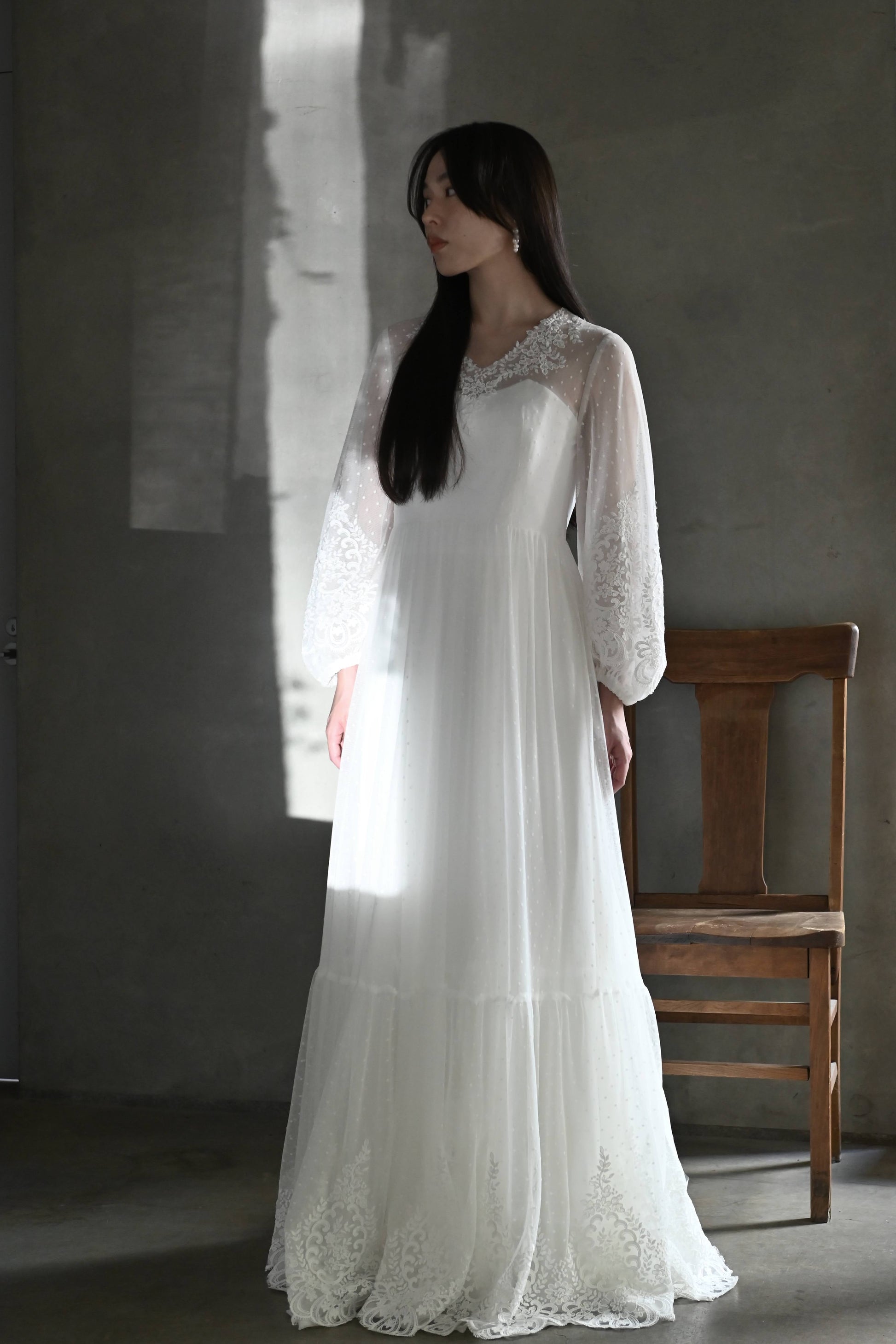 ドットレースの上にレースの刺繍を重ねた繊細なドレスです。