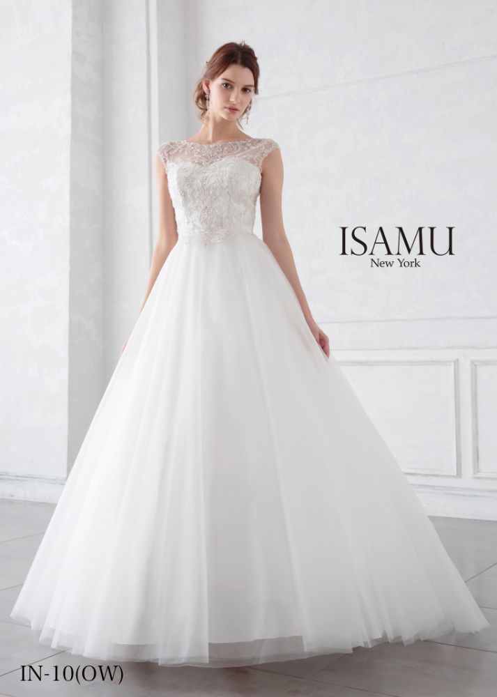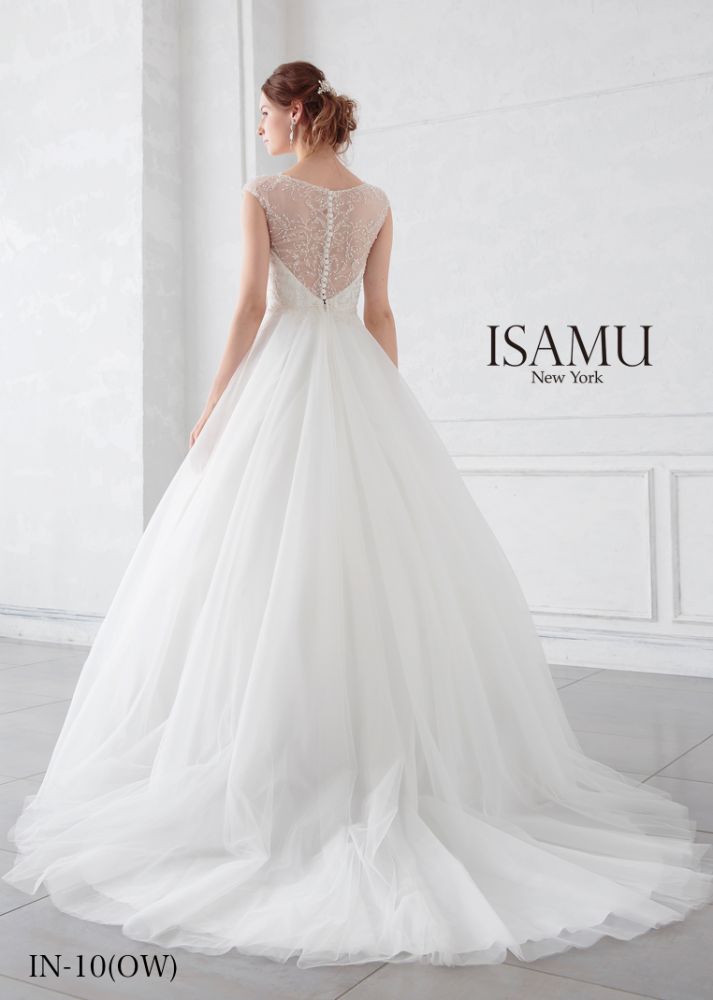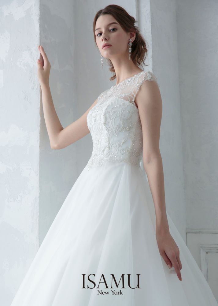 立体的なビーズ刺繍をデコルテから、背中、身頃全体へと、繊細かつ豪華にデザインされたウェディングドレスです。