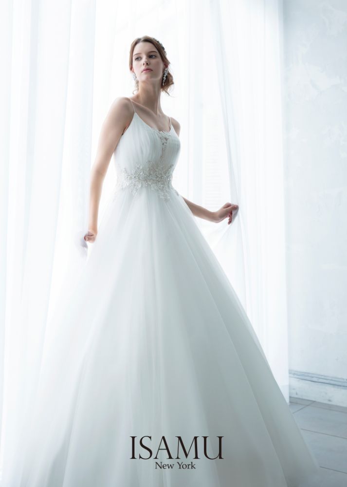 伸びやかなチュールのAラインのスカートがシンプルでありながらエレガントな佇まいを感じさせます。