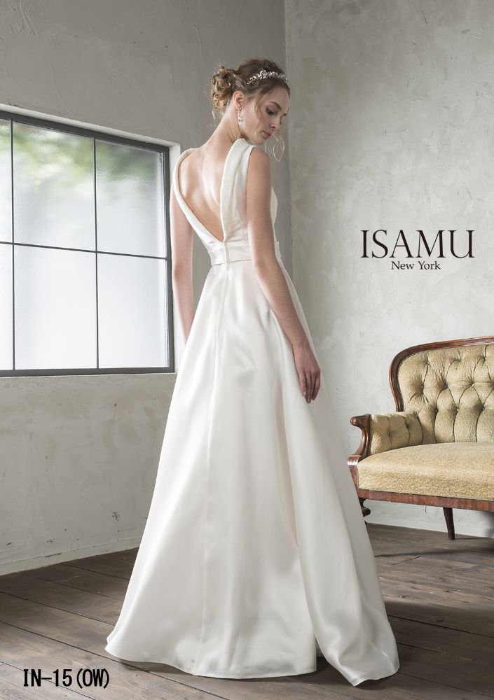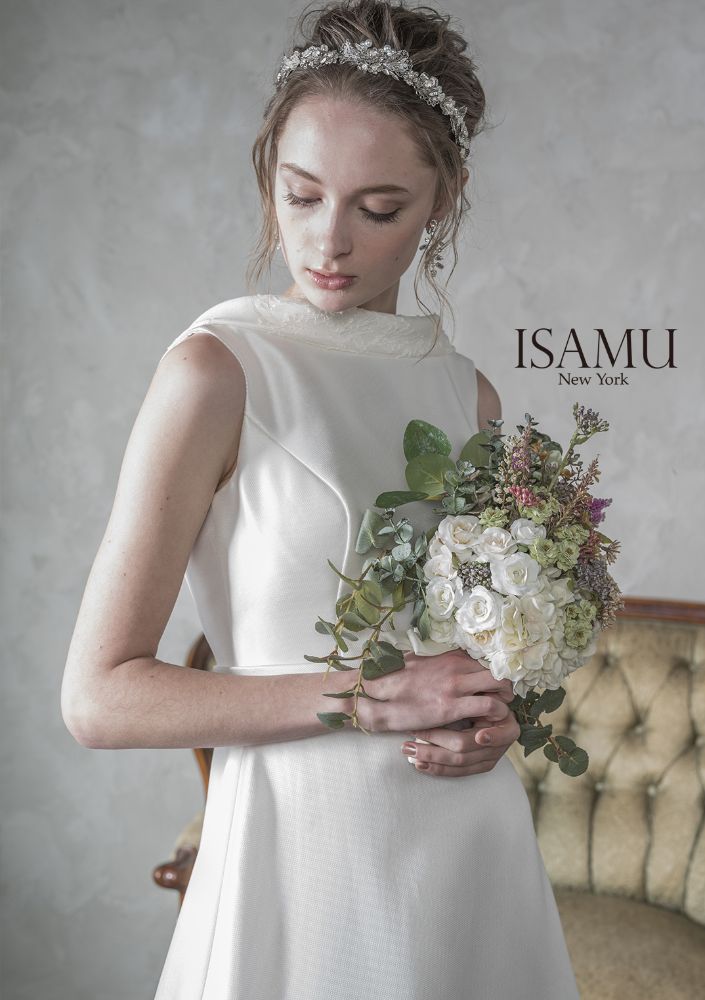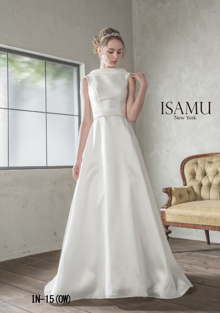 独特な質感を感じさせるサテン素材を贅沢に使用した、モード感に溢れたウエディングドレス。
