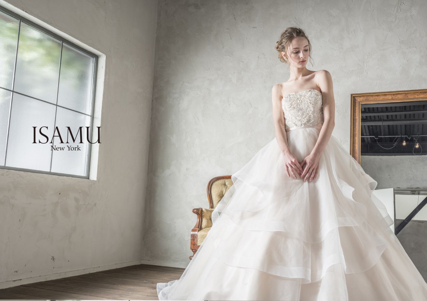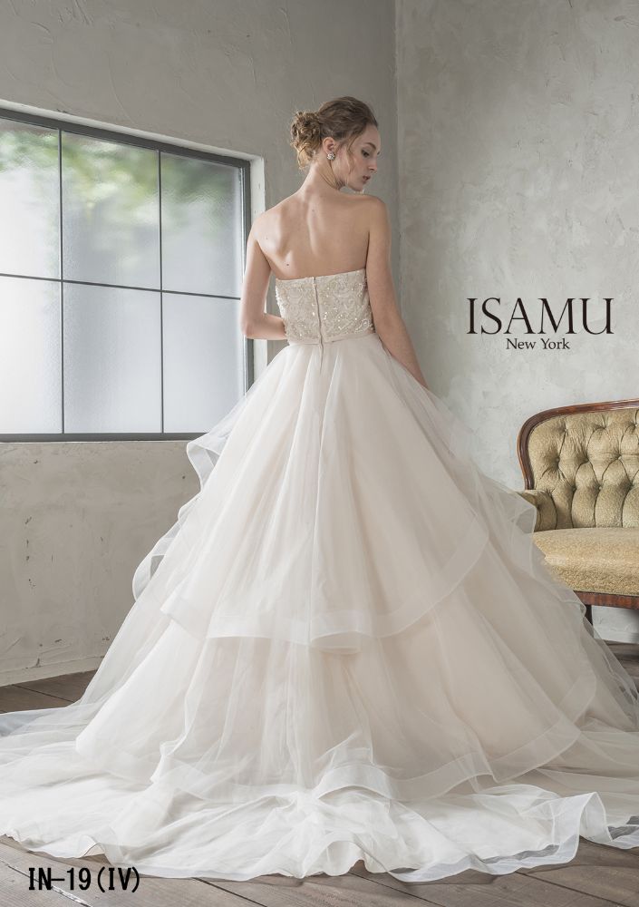 流行のホースヘアーで、ラッフルの動きを表現した、軽やかなウェディングドレス。