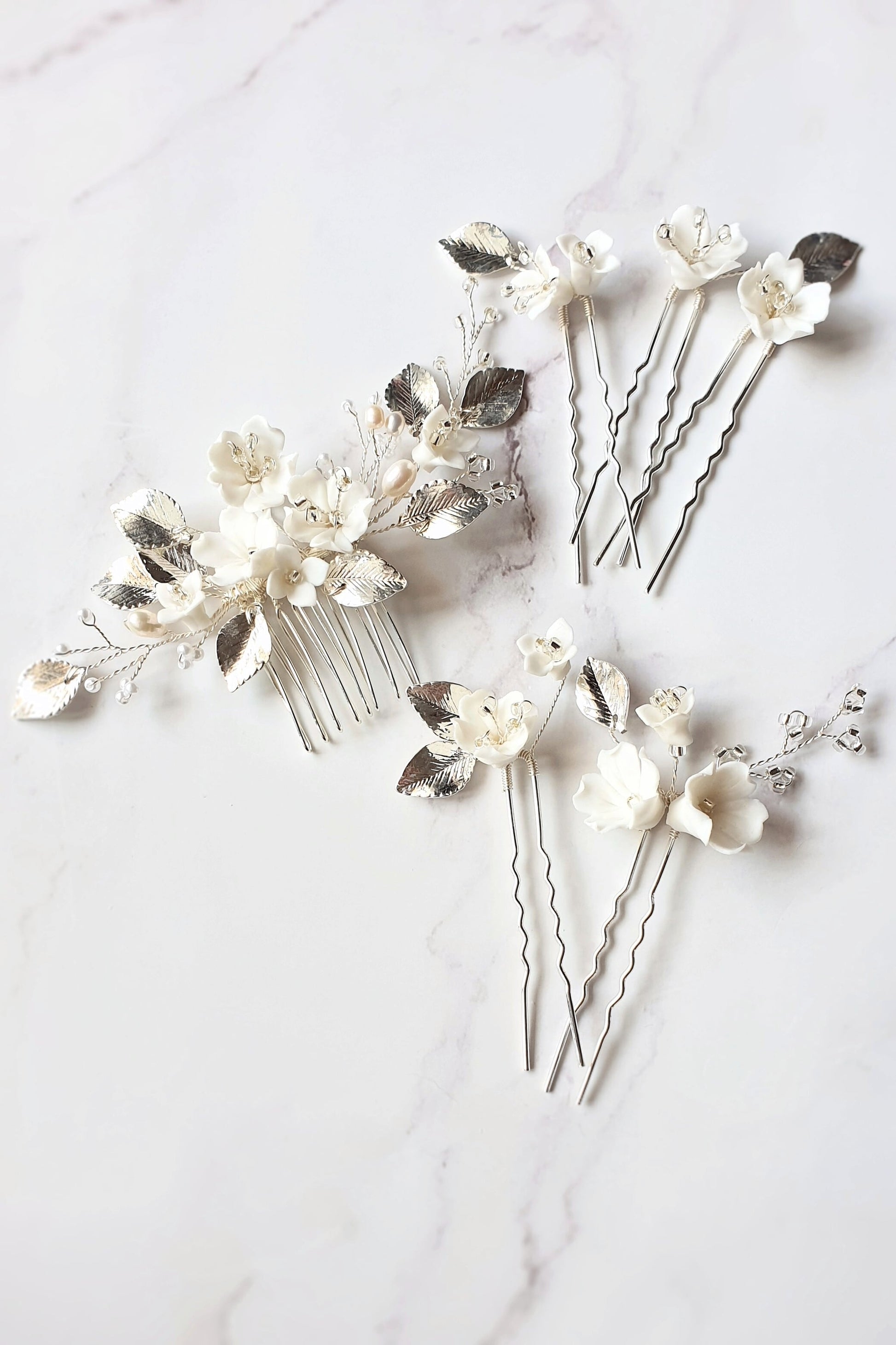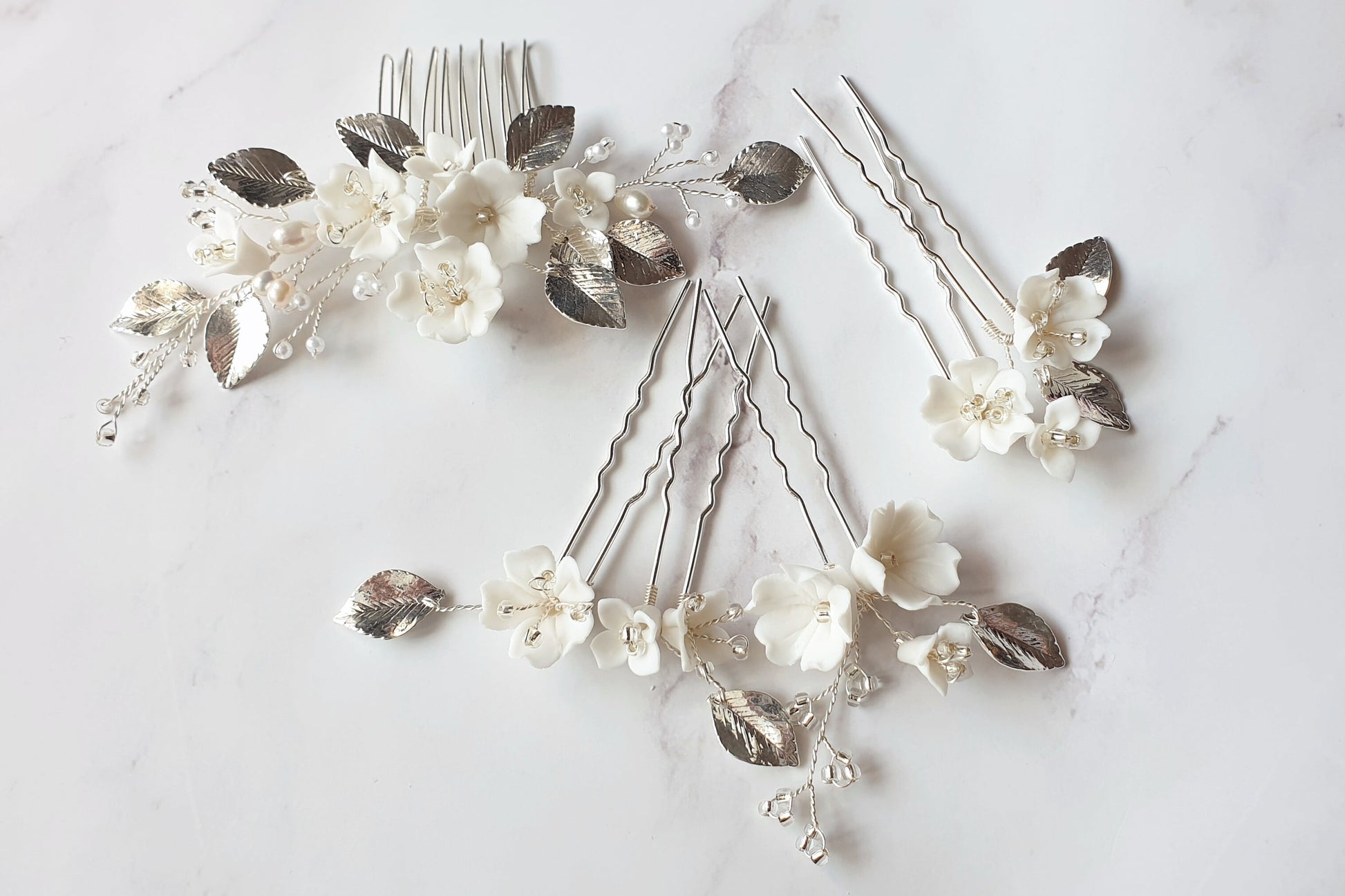 クレイフラワーとリーフのヘアコーム、ヘアピンのセットです。