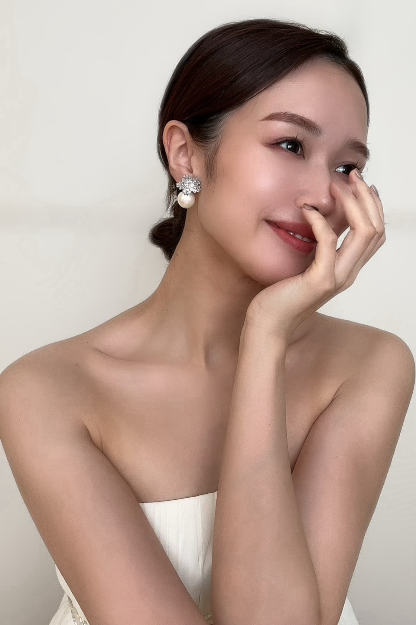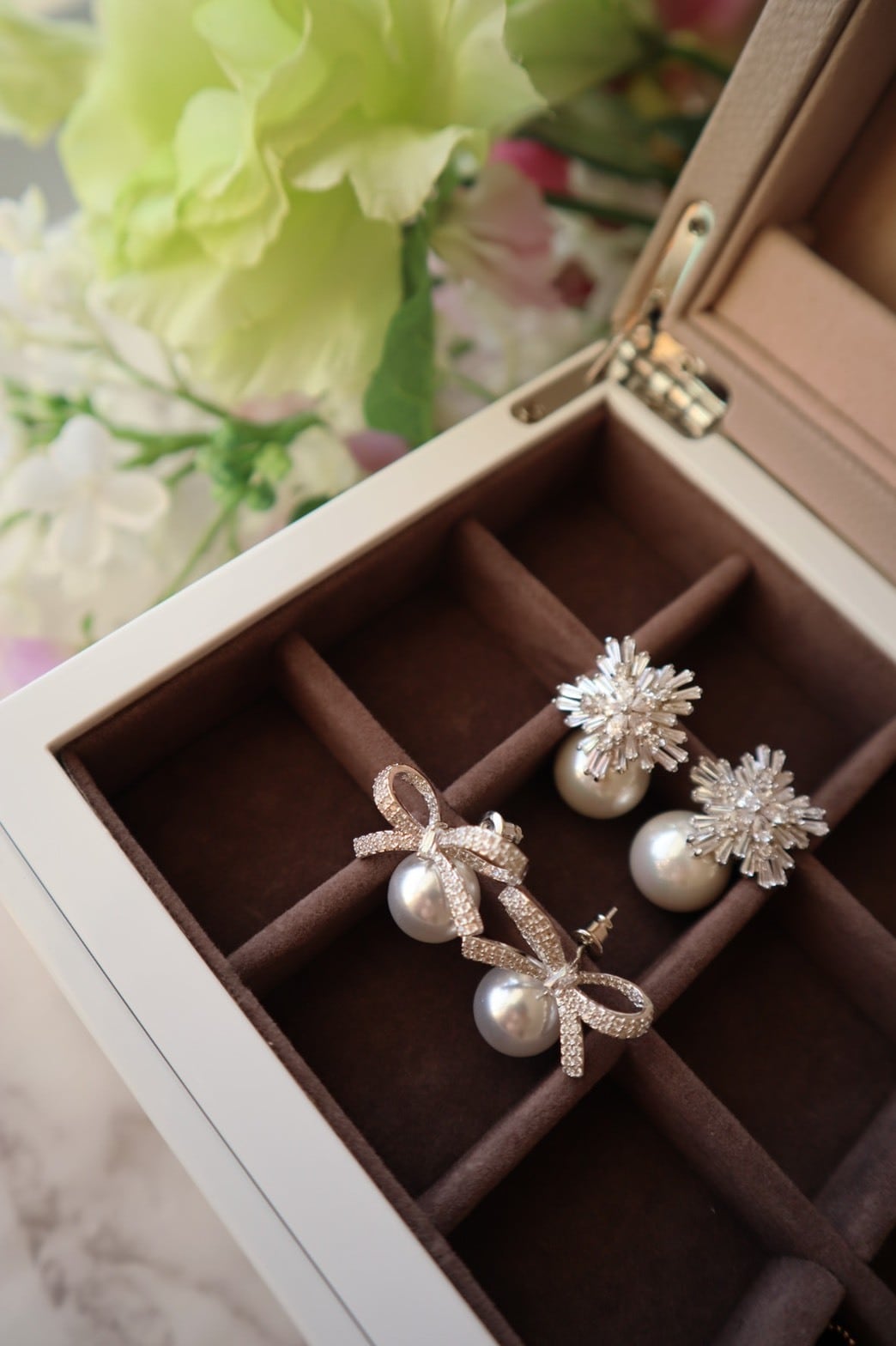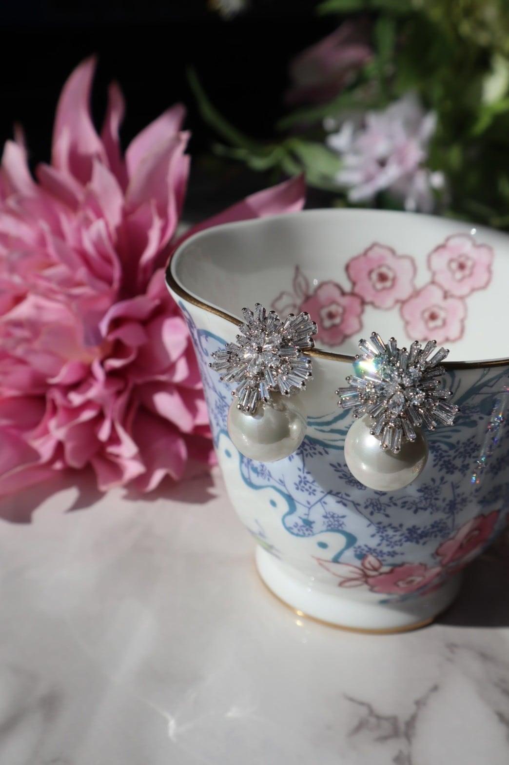 ジルコニアストーンと大粒のイミテーションパールを使用したピアスです。