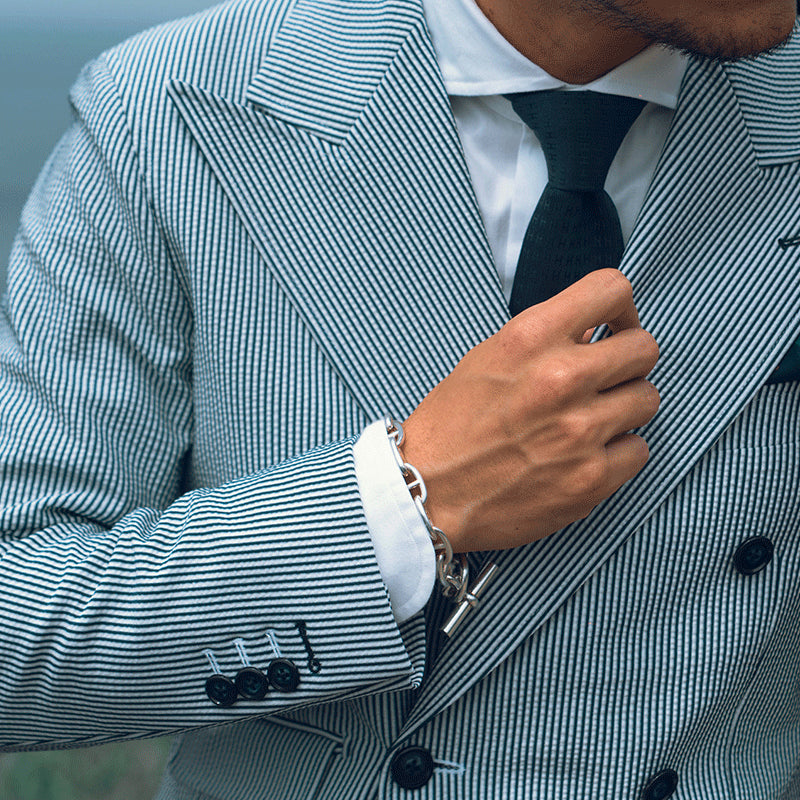 軽量のシアサッカー素材で仕立てたセットアップ。