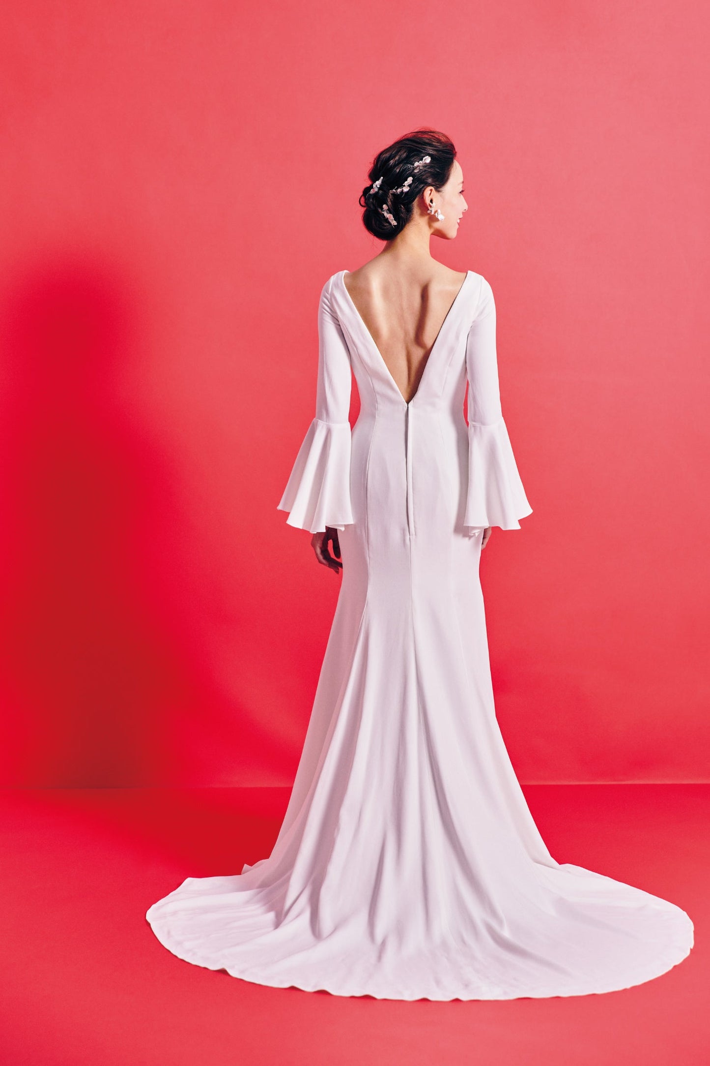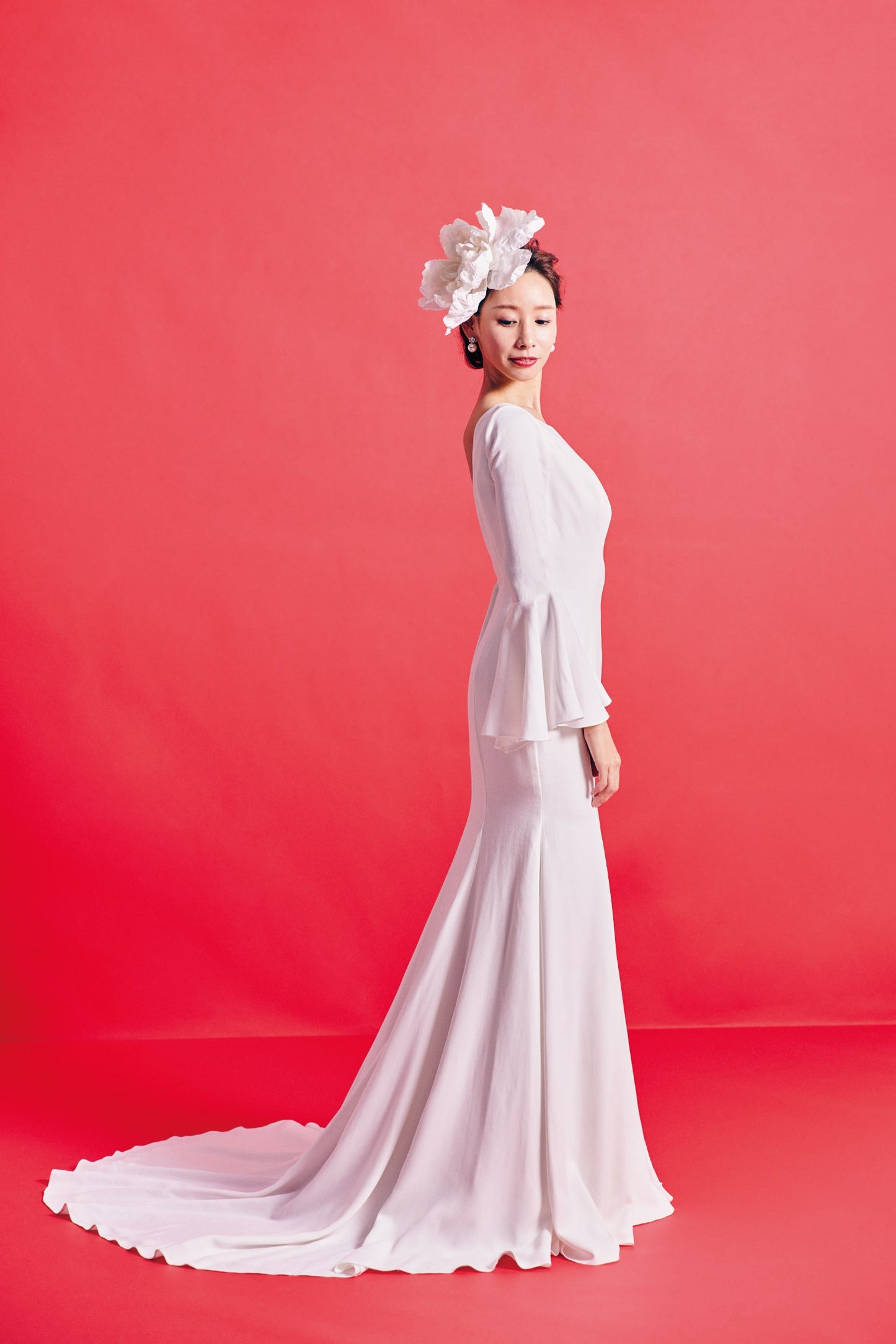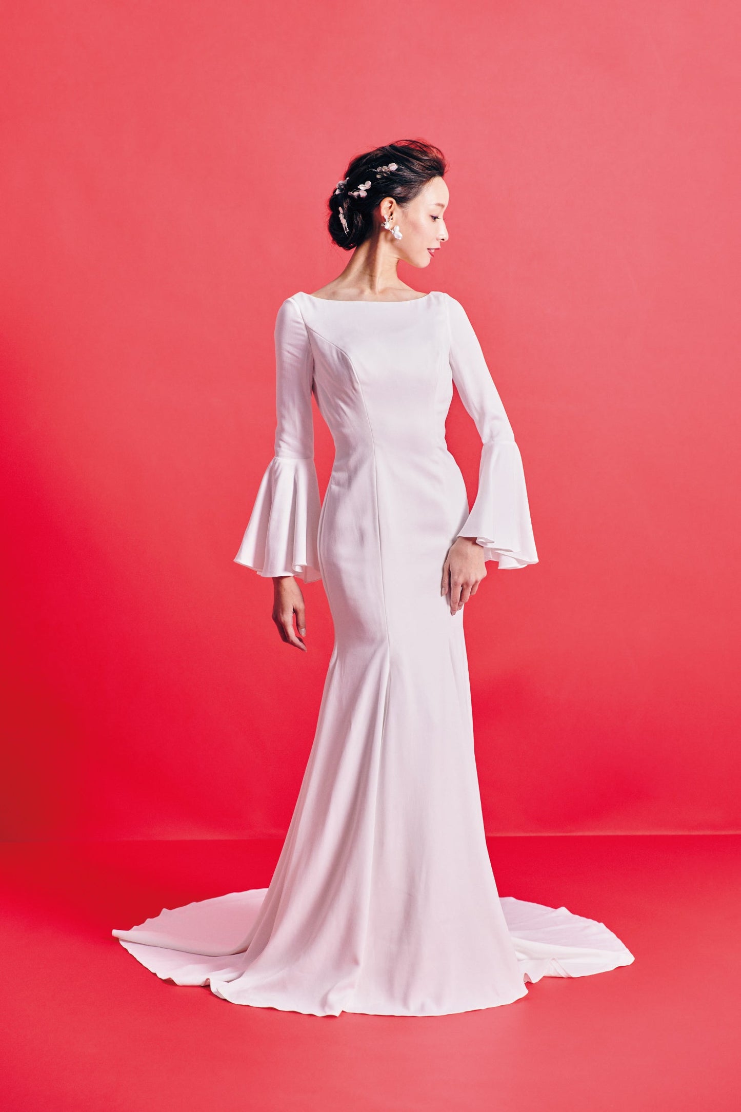 フロントのボートネックの清潔感と、背中の潔いVネックがギャップを感じさせる、大人デザインのマーメイドドレスです。