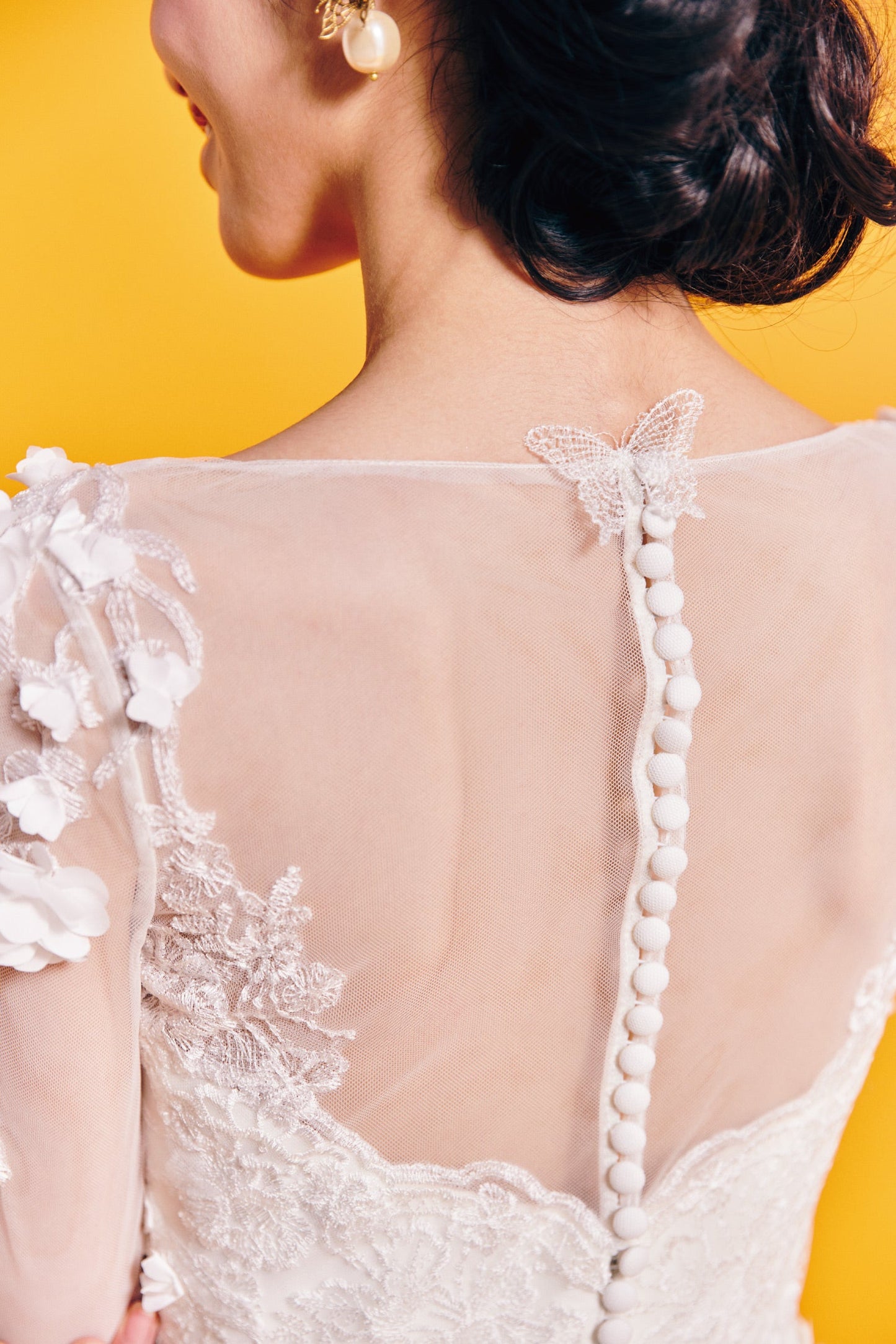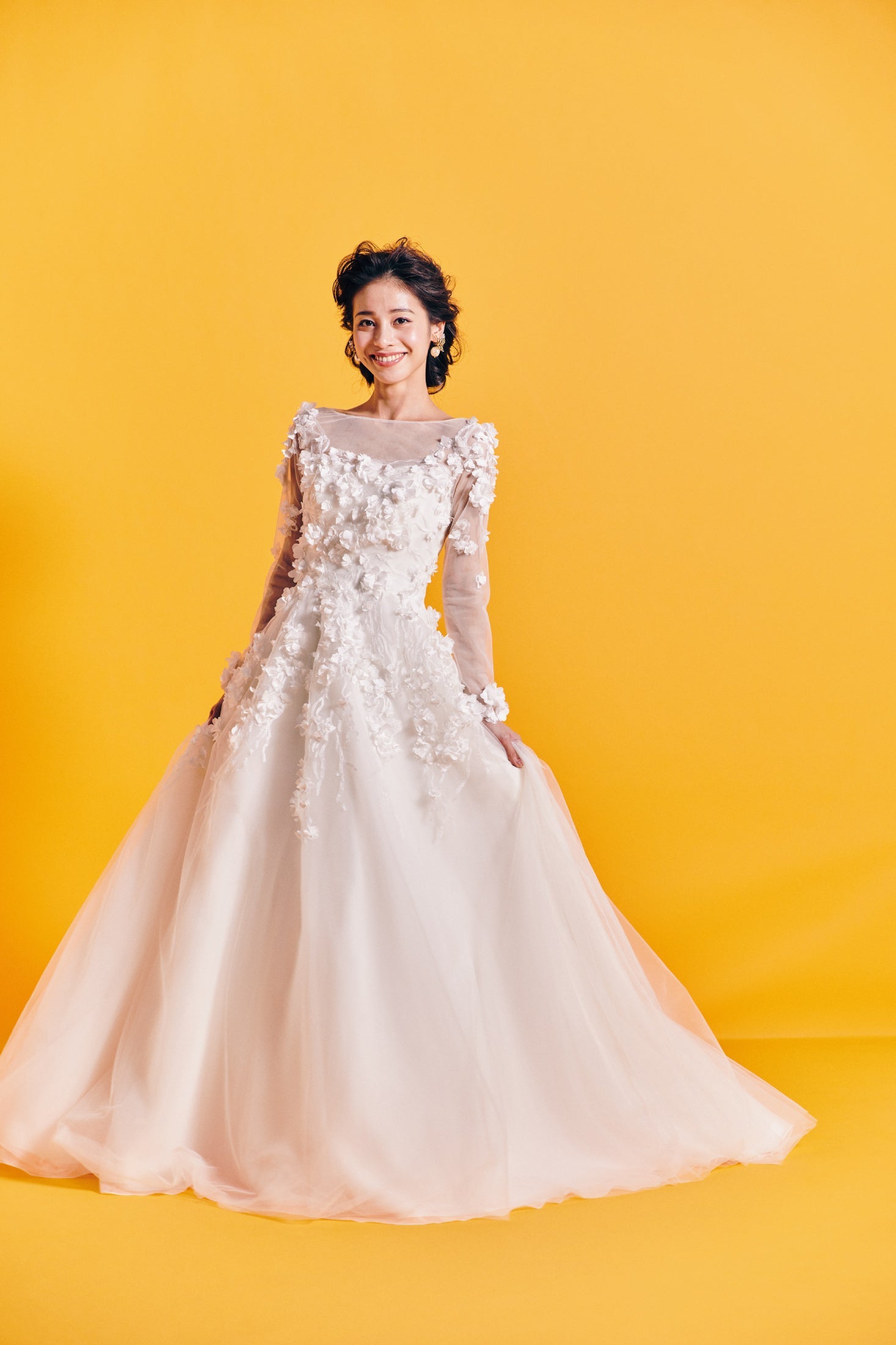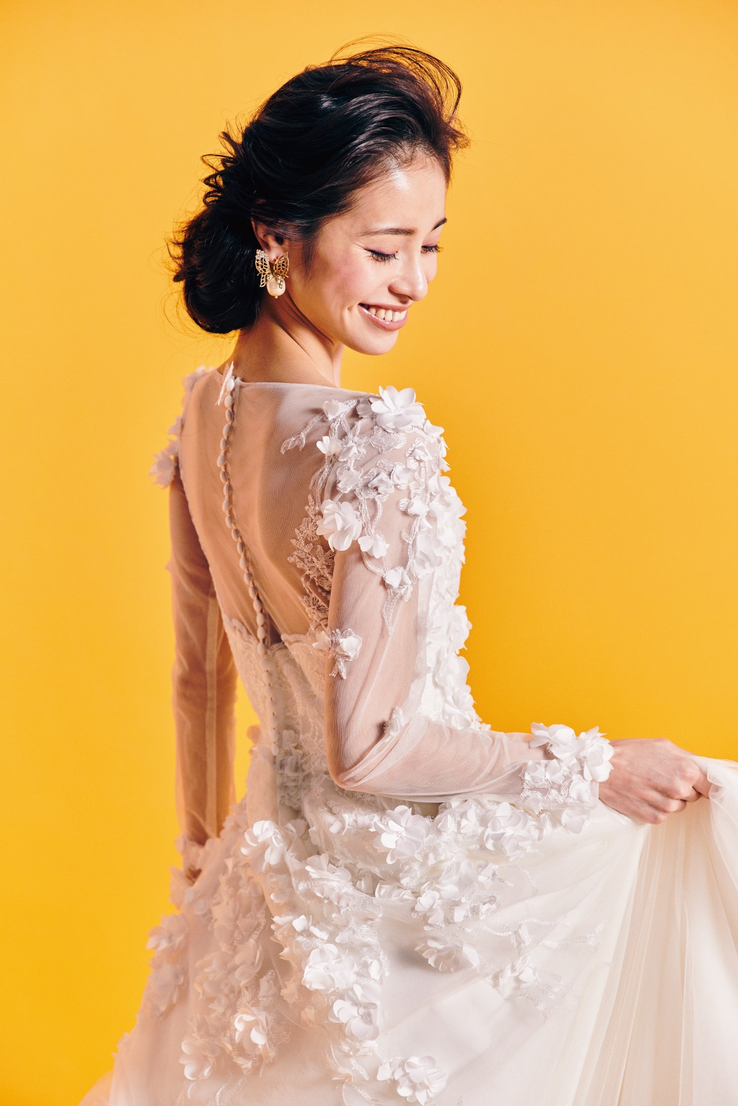 3Dフラワーモチーフを施し、女性らしく可愛い印象と、ロングスリーブの落ち着いた雰囲気が掛け合されたバランスの良いデザインです。