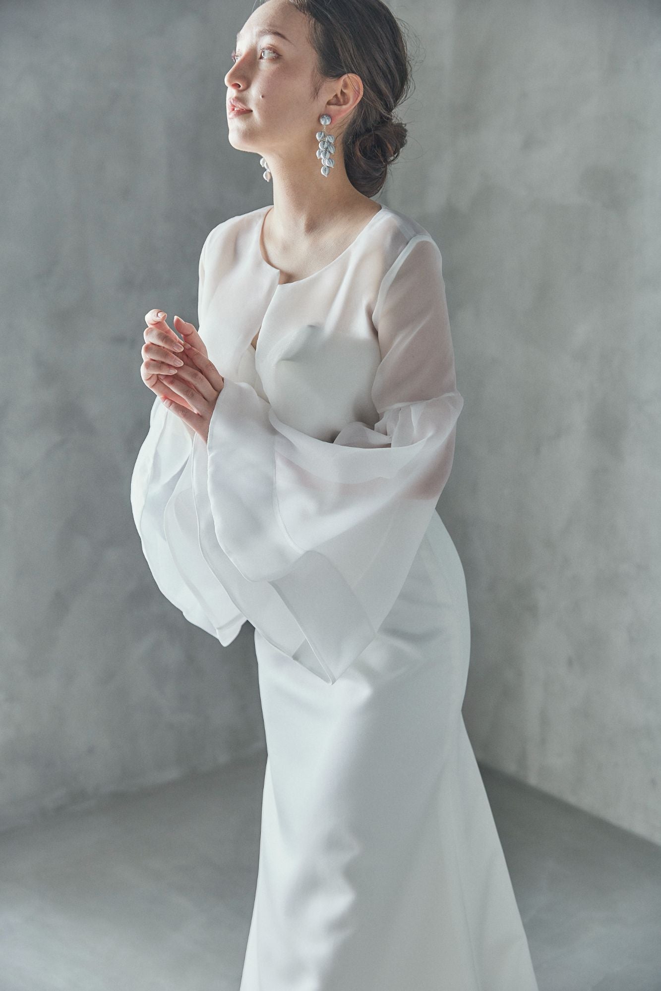 透明感のあるオーガンジーのジャケットを合わせることで、女神のような瑞々しさを演出し、2つのスタイリングをお楽しみいただけます。