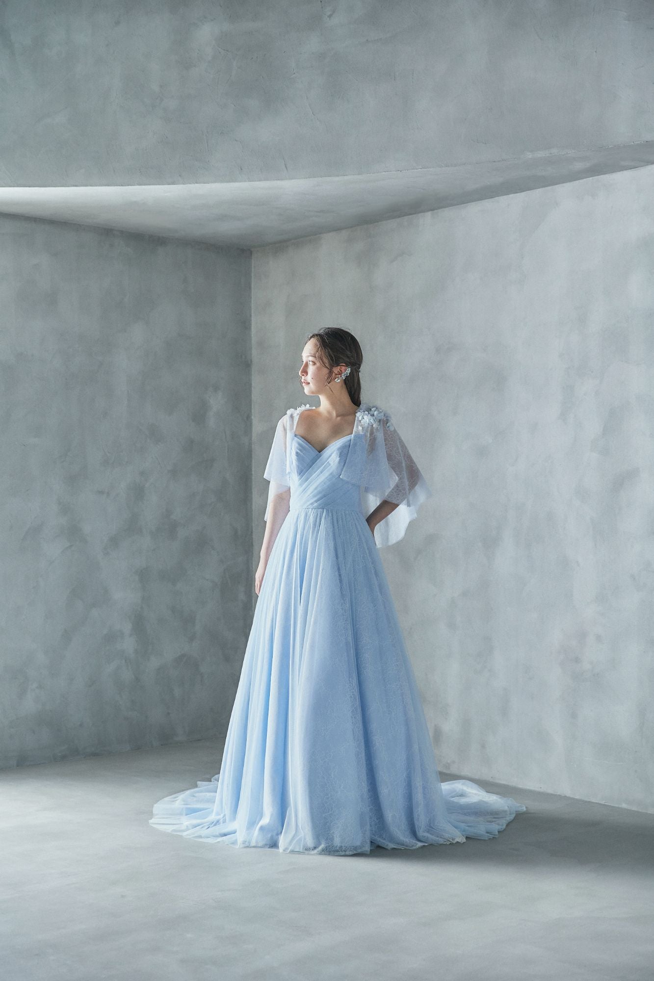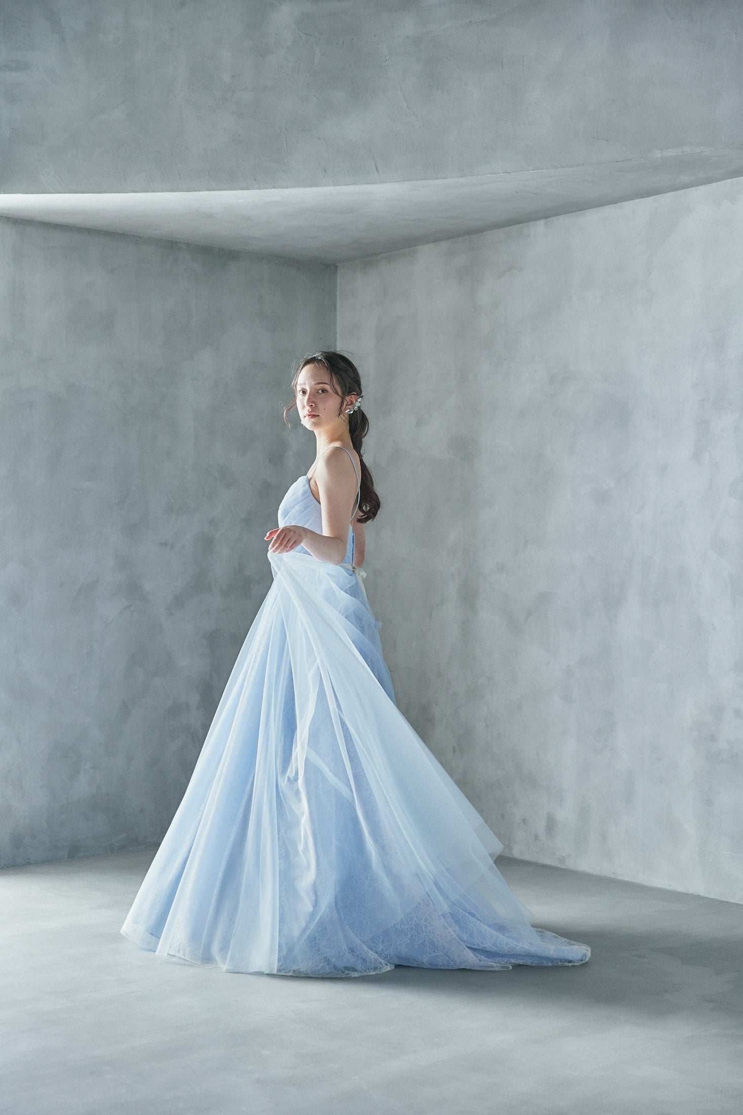 繊細なリバーレースに優しい水色のチュールを重ねたキャミソールタイプのドレス。