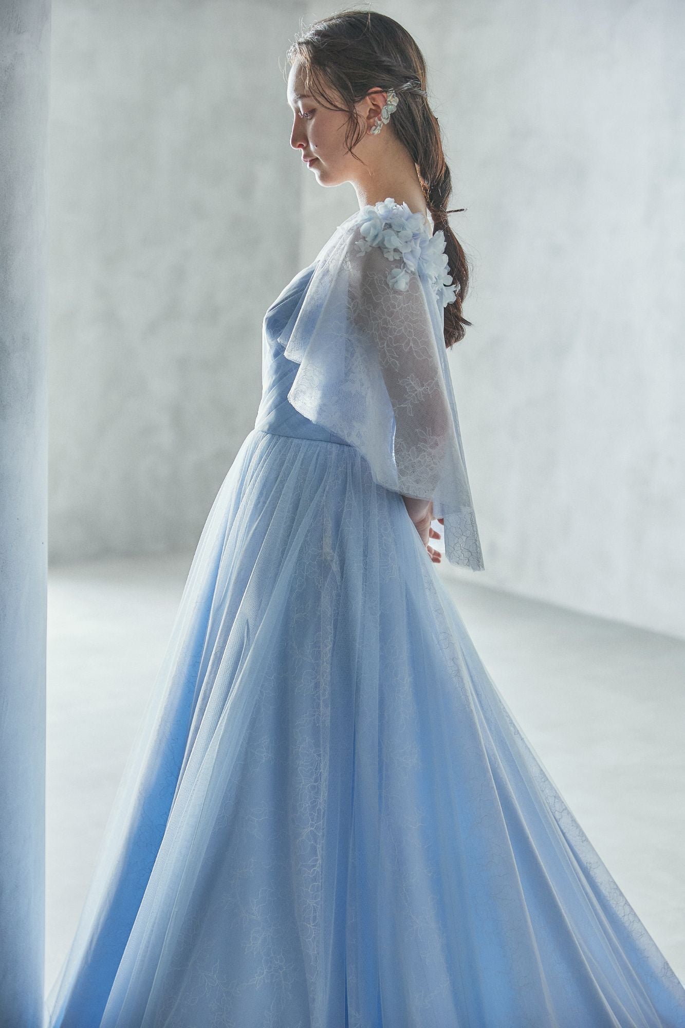 ケープが付属しており、肩に咲いたアジサイの花が可愛らしく、清らかな印象を与えてくれる1着です。