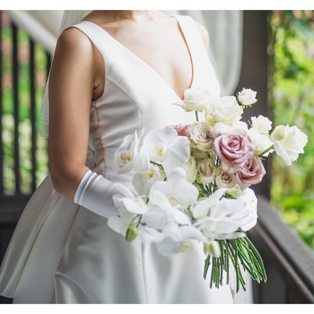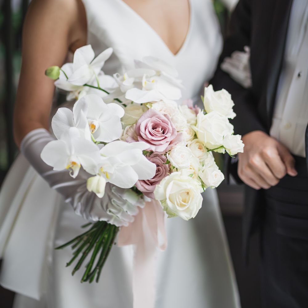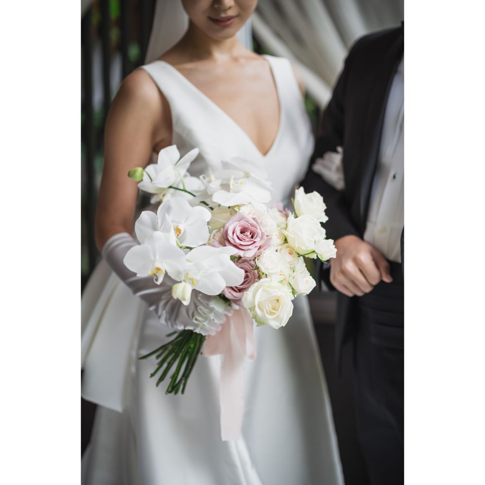 【生花】都内近郊お届け無料 クラッチブーケ 白×くすみピンク ホワイトローズ バラ 胡蝶蘭 【結婚式 フラワー 生花 ブーケ ブートニア】