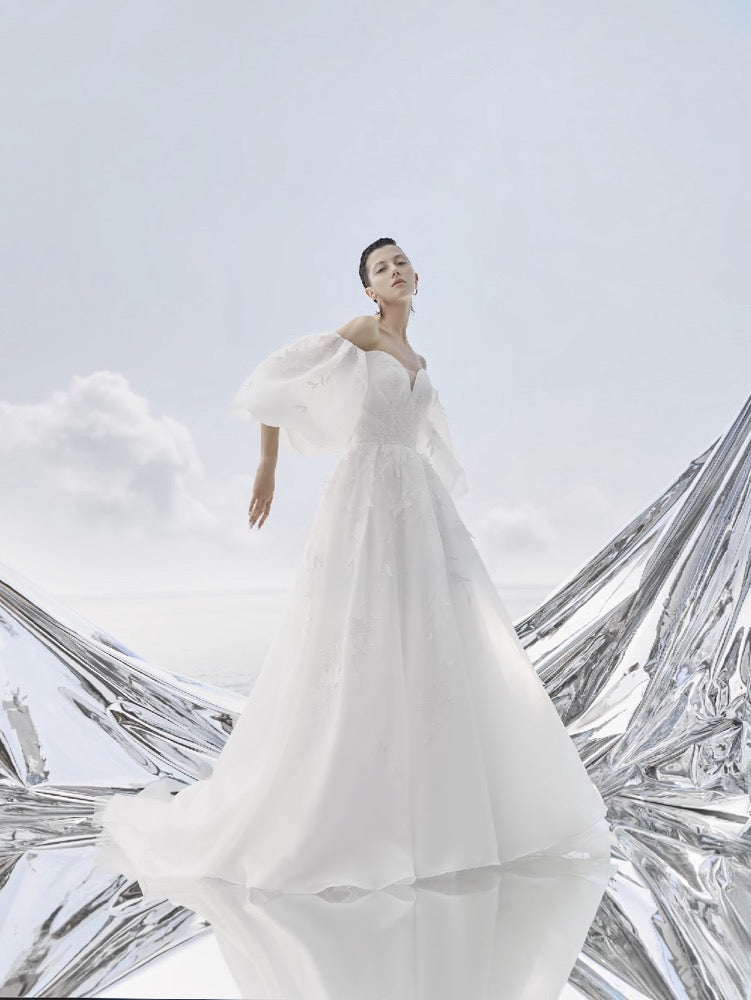 ボタニカルの刺繍が施された やかなオーガンジードレス。