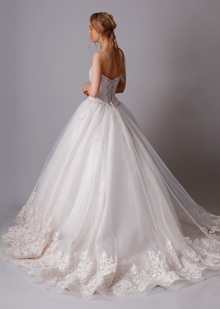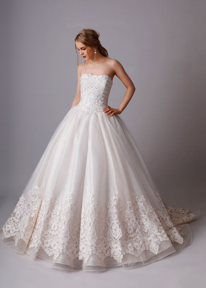アイボリーの色味が優しい印象を与える。ふんわり広がるチュールスカートと美しいレースは上品な女性に魅せてくれる。
