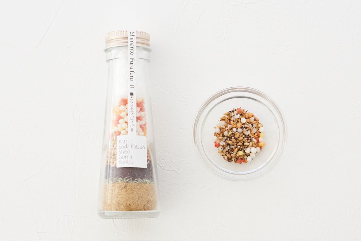 日本でも世界でも類を見ない、鰹節や貴重な宗田鰹節の粉をベースに、昆布・煎り胡麻・ぶぶあられに青のりや梅しそが原材料の、すべて天然素材の、粉のドレッシング。
