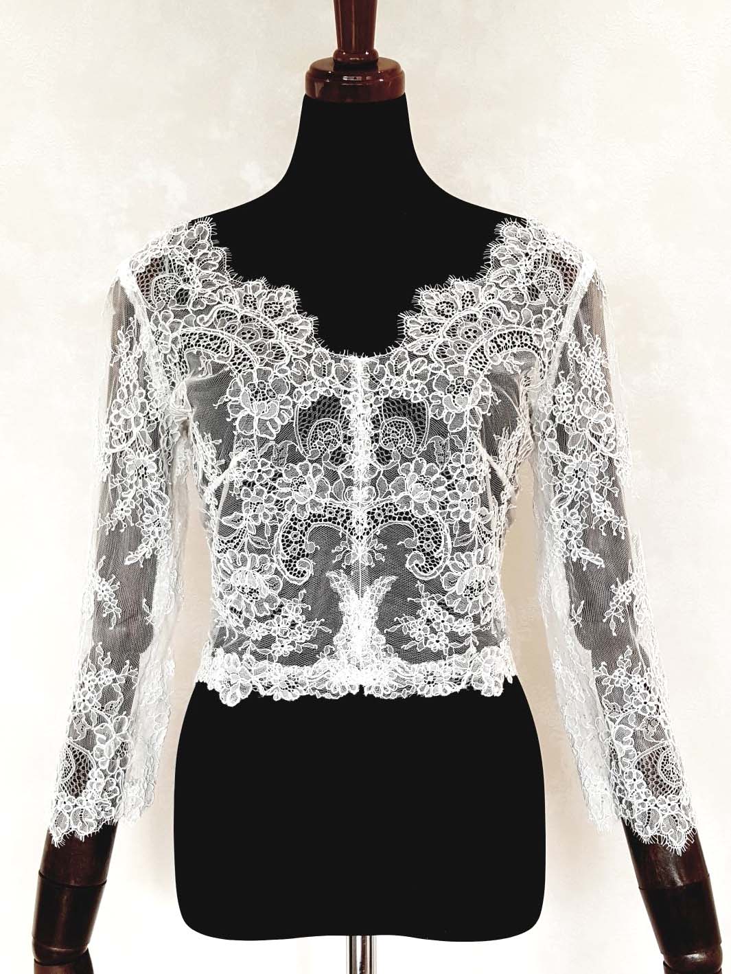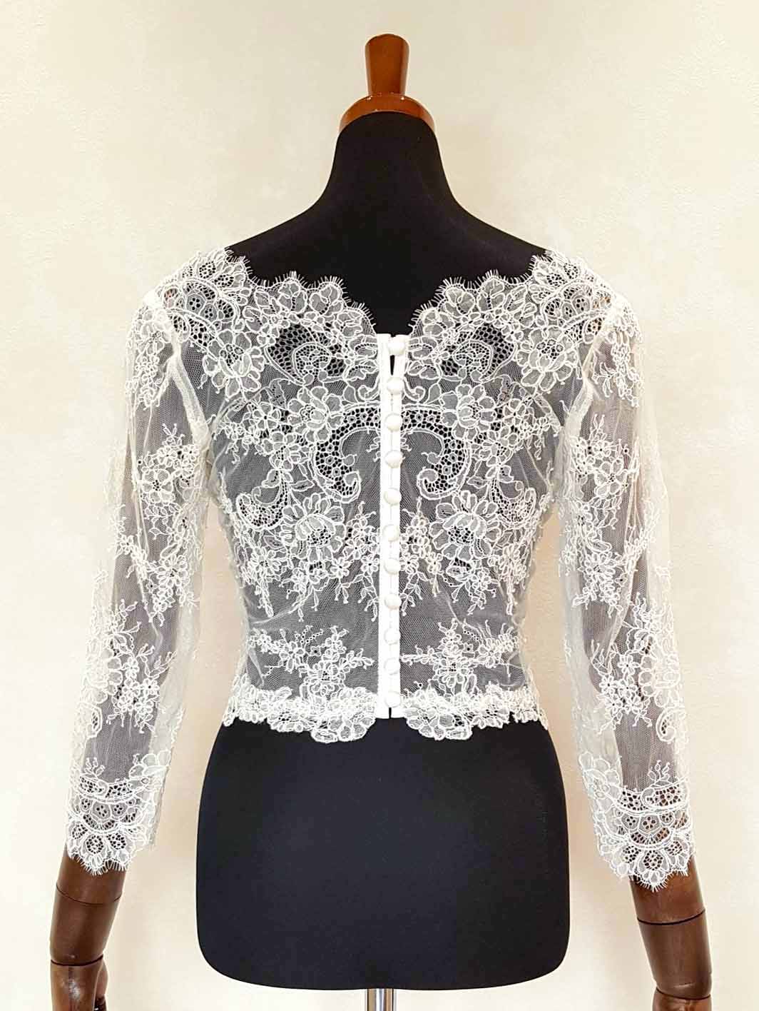 ウェディングドレスのアレンジ、お色直しに、8分袖の繊細なレースのボレロ。エレガントなレースボレロです。