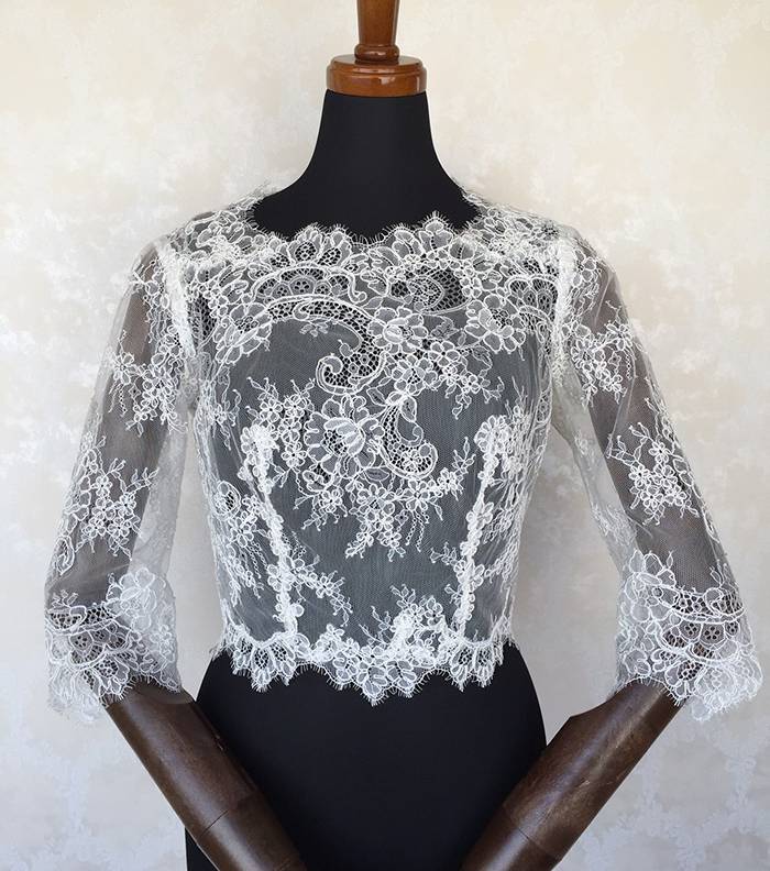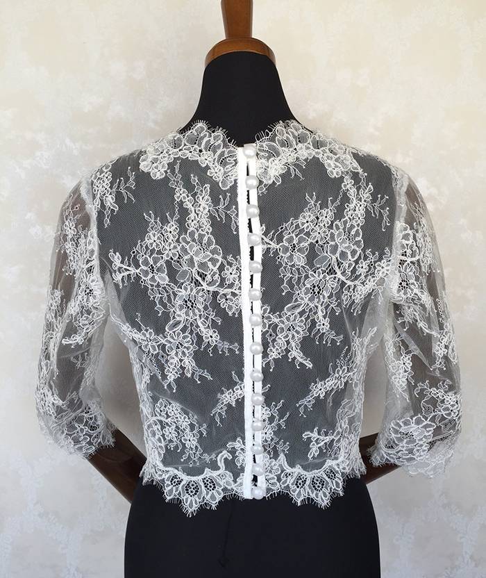 ウェディングドレスのアレンジ、お色直しに、七分袖の繊細レースのボレロ。 透き通るような繊細なお肌の花嫁を演出します。