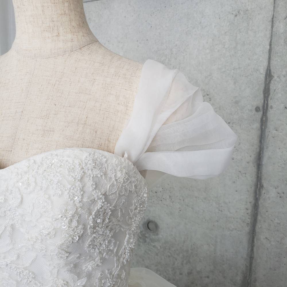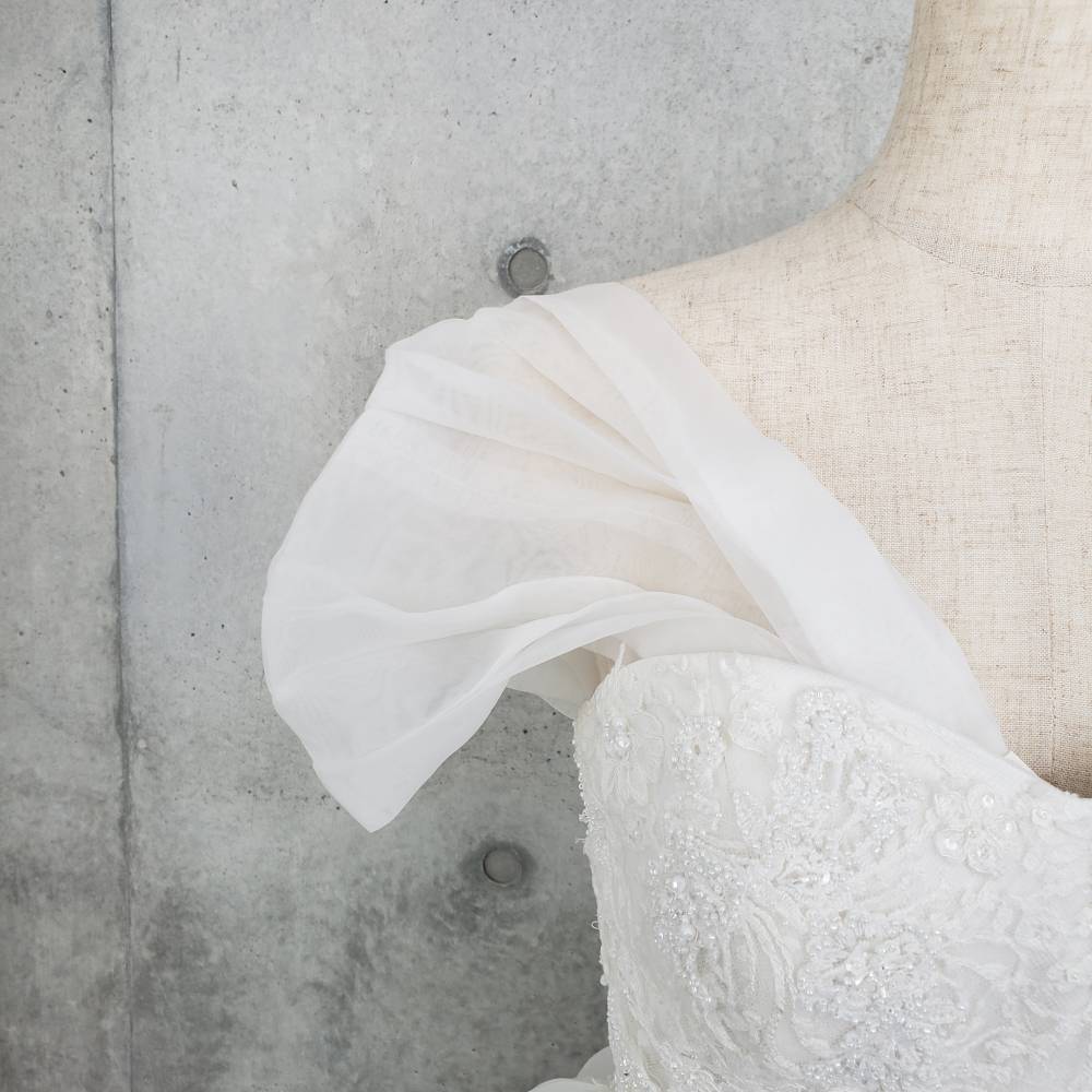 ウェディングドレスのアレンジ、お色直しに、オーガンジー素材ののオフショルダー。