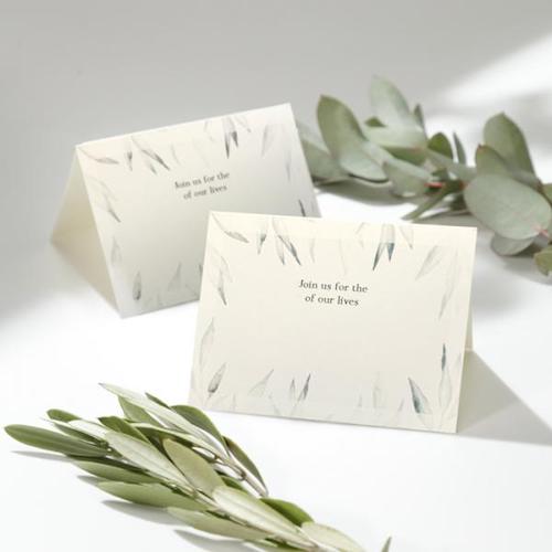 爽やかなオリーブの葉が、ナチュラルな雰囲気あふれる人気の席札。緑の葉が優しい印象で、好感度の高いデザインです。