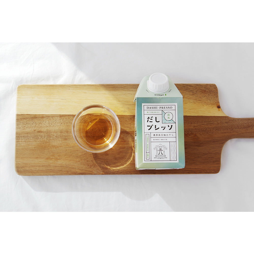 だしプレッソは、焼津産鰹節・北海道産真昆布100%で仕上げた液体だしです。濃厚なうま味と鮮やかな香りを閉じ込めた、だしのエスプレッソです。