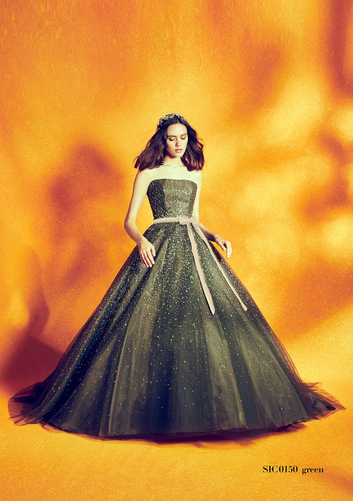 深い緑色のチュールに散りばめられたグリッターがキラキラ輝く大人かわいいドレス。