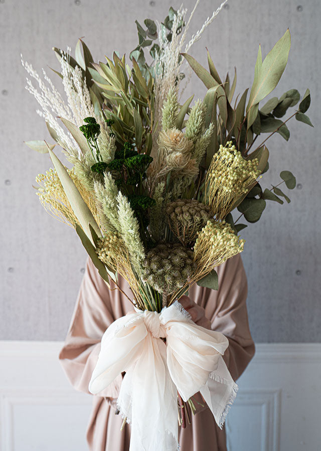 【ドライフラワーブーケ】 ナチュラルなグリーンだけのブーケ Forest Green 柔らかいオーガンジーリボンをつけて 【結婚式 フラワー ドライフラワー ブーケ ブートニア】