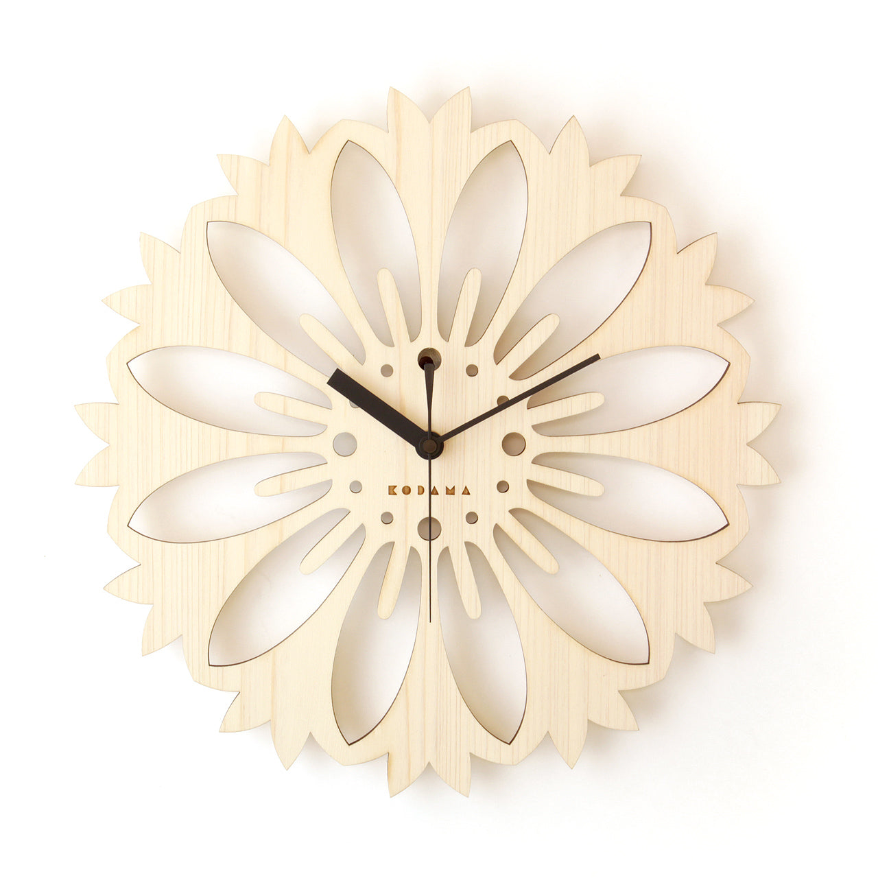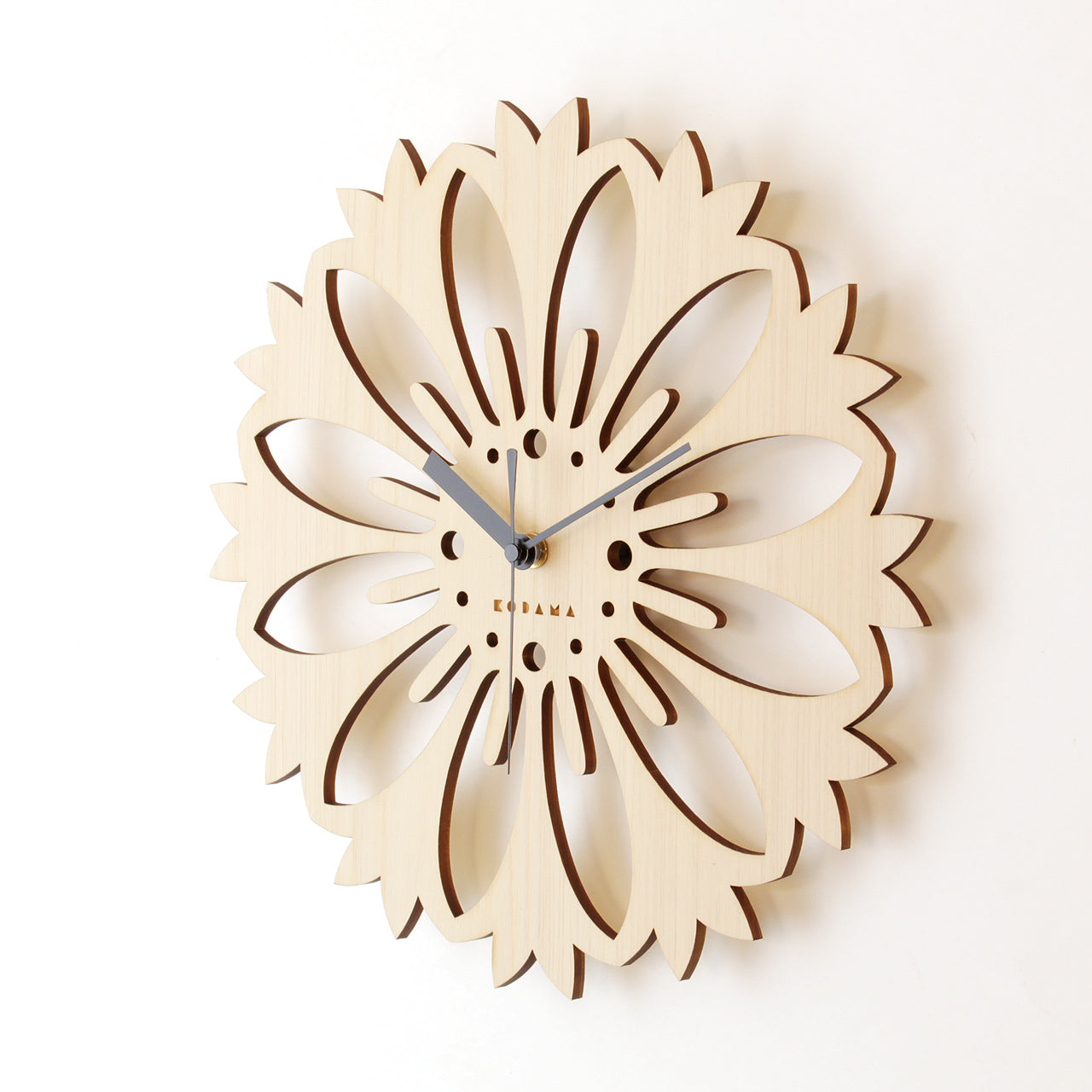 ヒノキに繊細な透し彫りを施した上品でシンプルな掛け時計です。