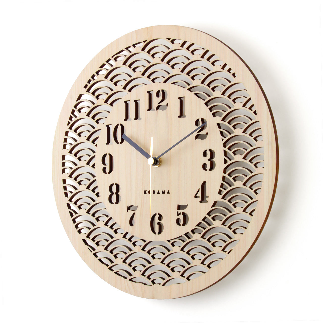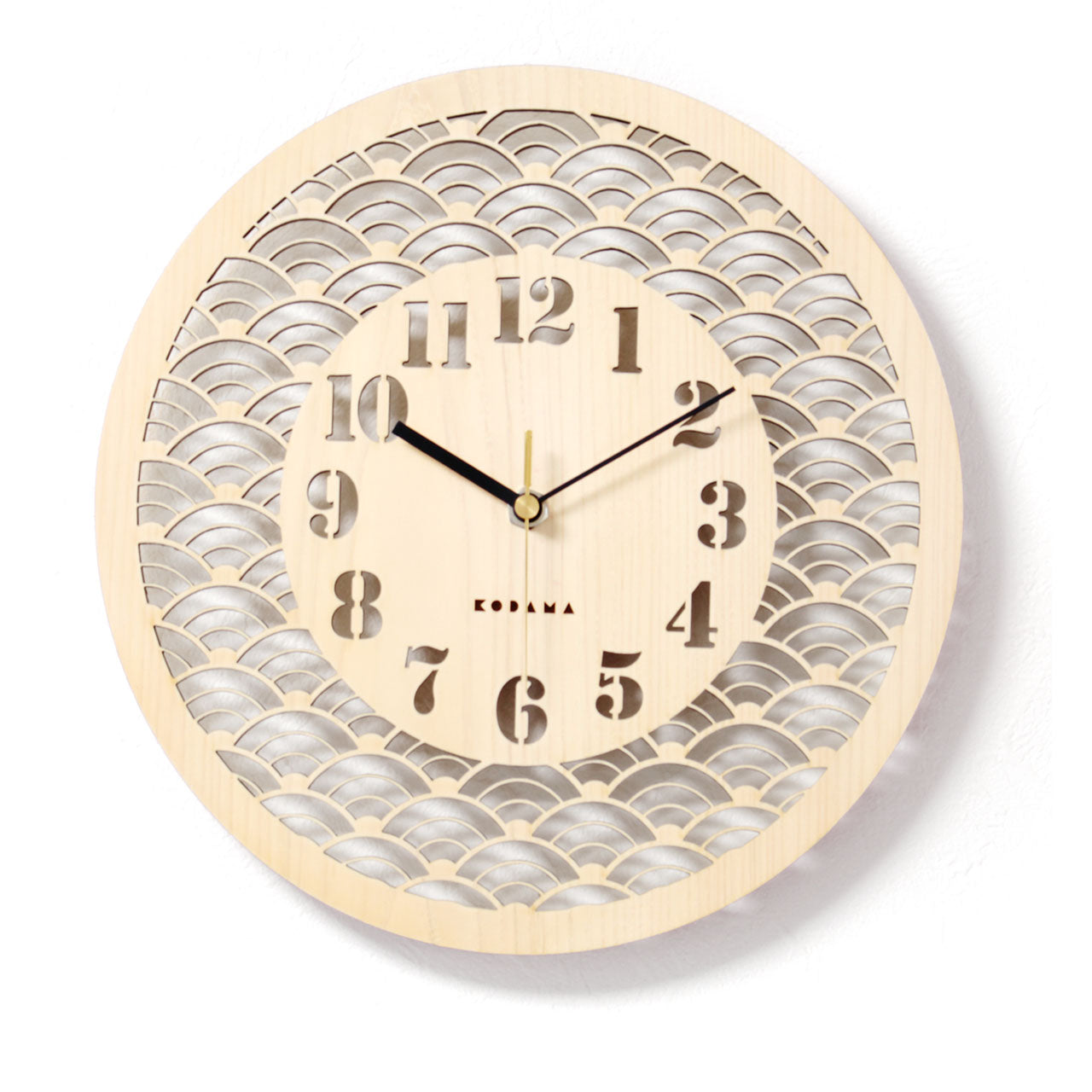 ヒノキに繊細な透かし彫りを施した上品でシンプルな掛け時計です。