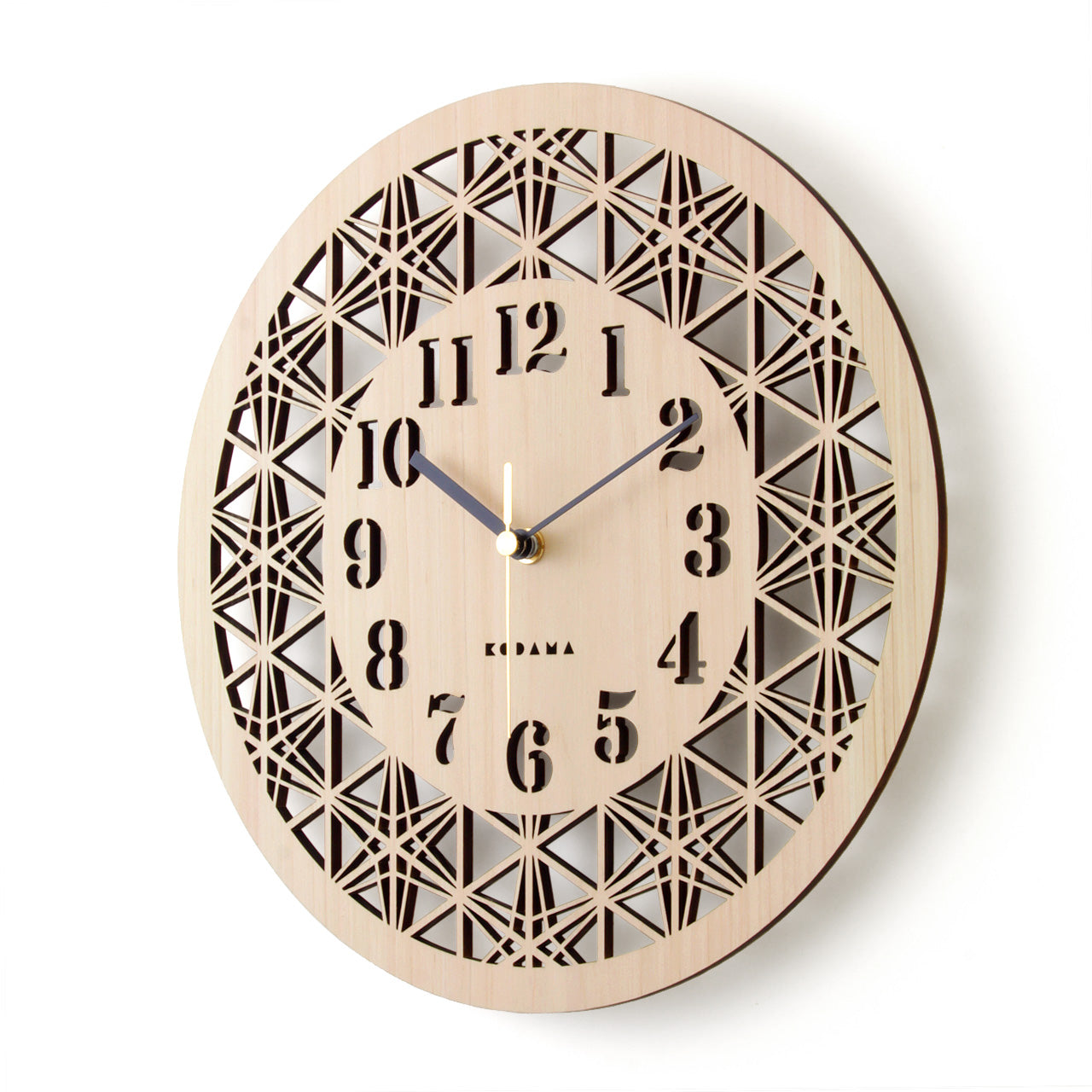 ヒノキに繊細な透かし彫りを施した上品でシンプルな掛け時計です。