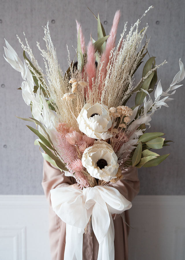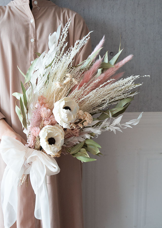 白をメインにポイントにスイートピンクを使用して華やかで可愛らしいイメージに。グリーンを添えてナチュラルで柔らかいドライフラワーのクラッチブーケです。