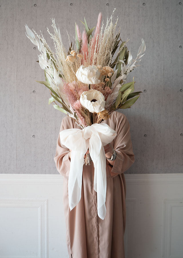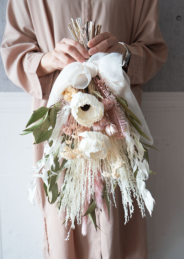こちらはドライフラワーで制作しています。強い力を加えるとブーケの形が崩れたり花びらや葉が落ちてしまいます。優しく丁寧にお取り扱いお願い致します。
