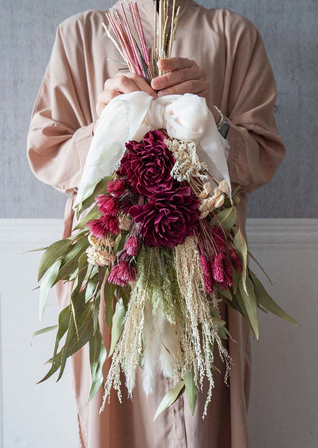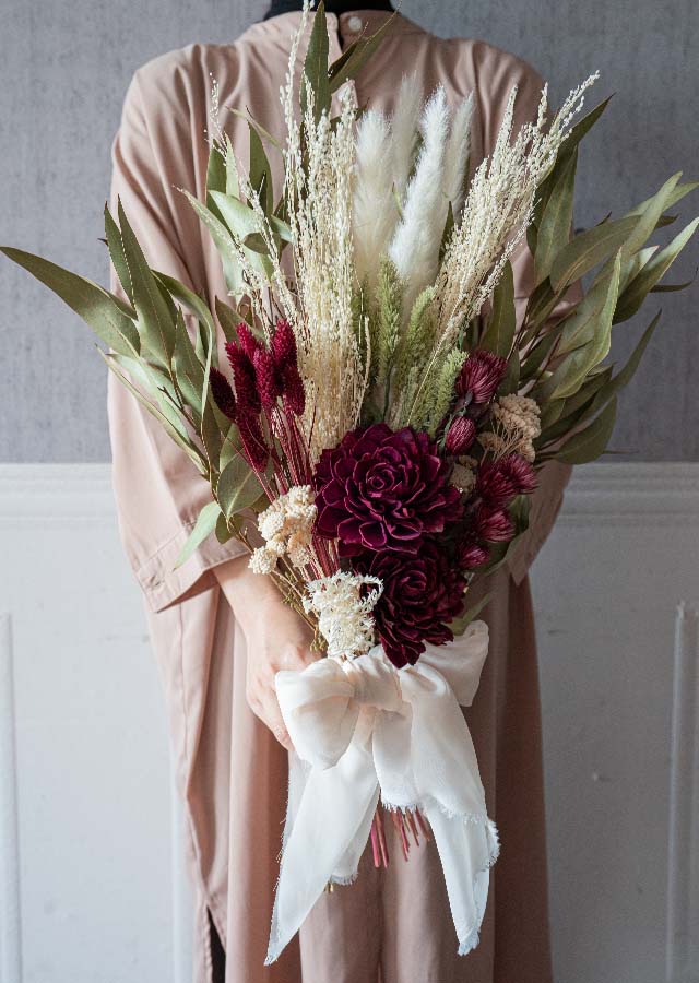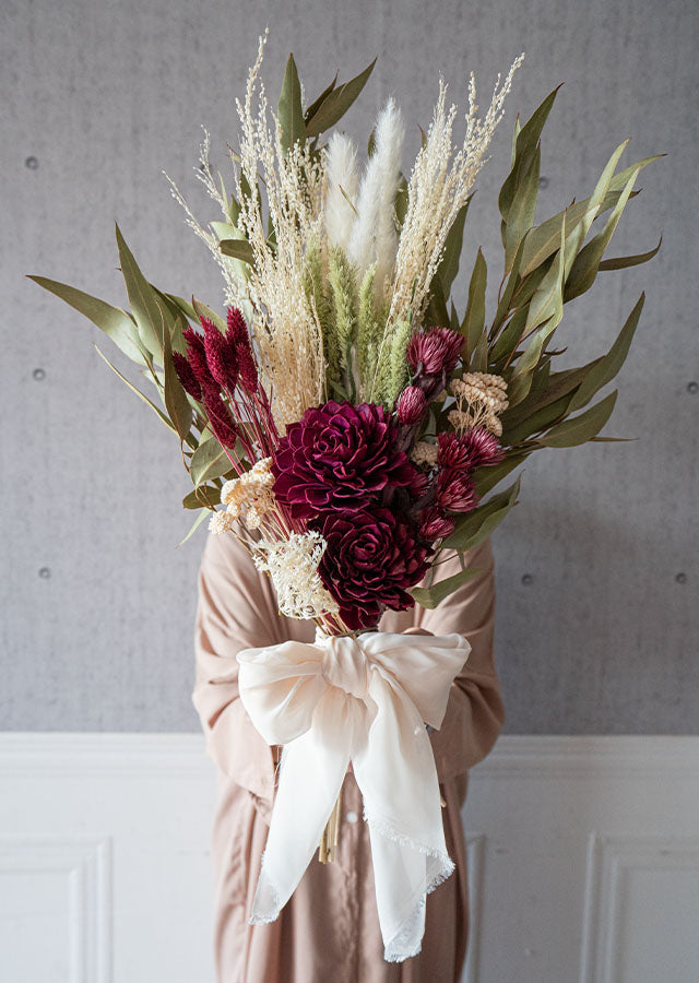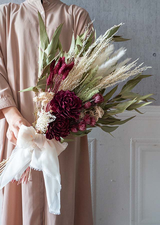 カジュアルなドライフラワーに上品さをプラスして仕上げました。ナチュラルでやわかく上品、可愛らしいボルドー色のドライフラワーのクラッチブーケです。