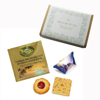 ハワイコーヒーのトップブランド、ロイヤルコナのワンドリップと、限定の湘南クッキー&小石の型をしたマーブルチョコレートのセットです。