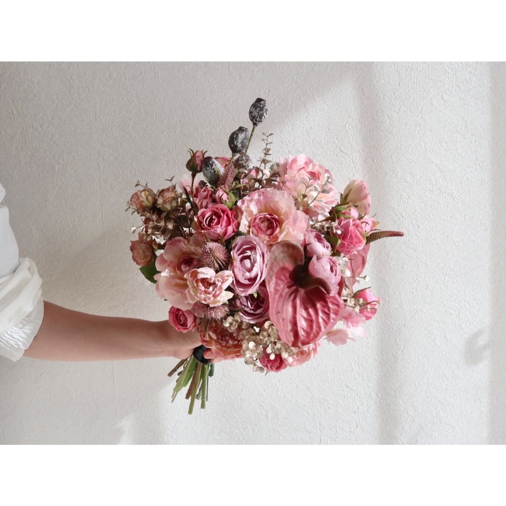 くすんだピンクにゴールドの葉を混ぜて、上品だけど甘い、ロワイヤルなブーケ
