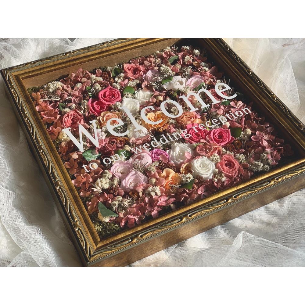 お客様ご要望の額縁の中にドライフラワー、プリザーブドフラワー、アーティフィシャルフラワーなどの花材を使用したフラワーボードアレンジメントとなります。