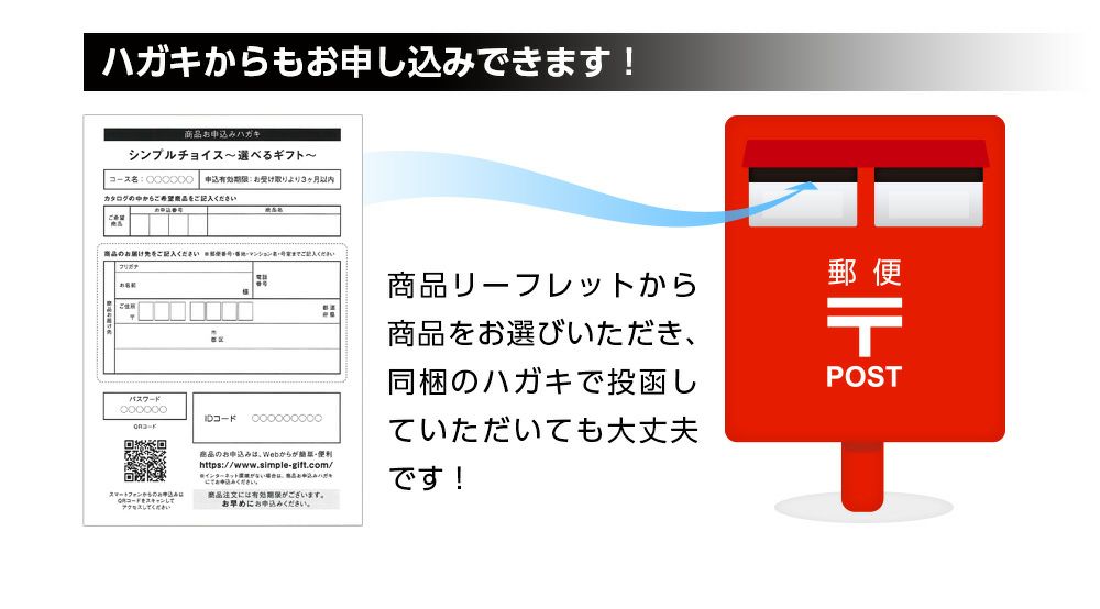 同封のハガキに記載されているQRコードから専用サイトにアクセスすれば、IDコードやパスワードの入力を省略でき、リーフレットには掲載されていない限定商品もお選びいただけます。