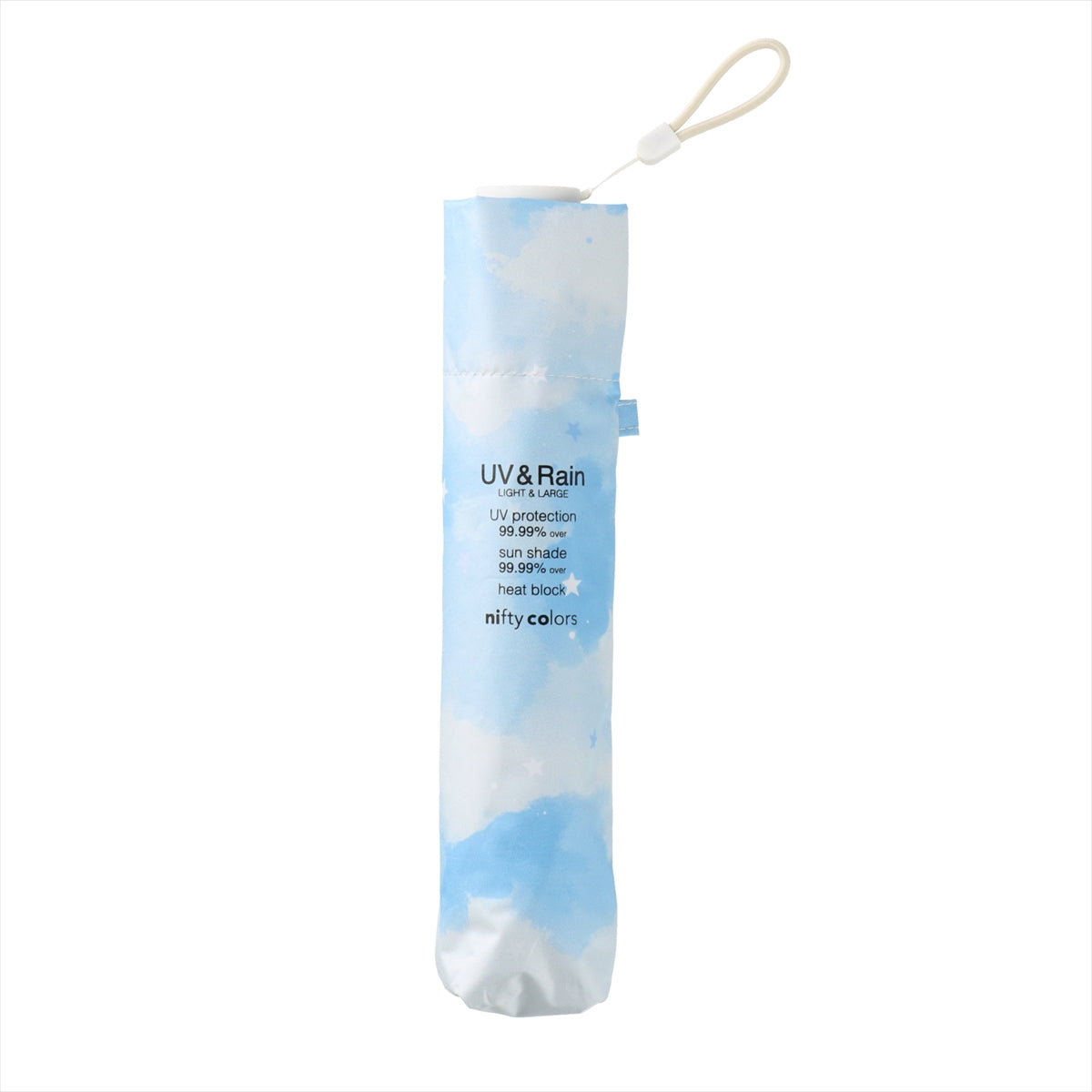 可愛いモチーフですが爽やかな水色で描かれているので、甘すぎずスッキリとした傘です。手元とストラップを白系で統一してクリーンで爽やかな雰囲気です。裏側のポリウレタン加工の色はブラックになっているので、表の柄を引き立てつつ光を吸収し日陰を作る効果があり、強い日差しに最適です。