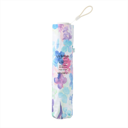 水彩で描いた色とりどりな花が重なり合い、シアー(透明)感を出した優しい印象のデザインです。