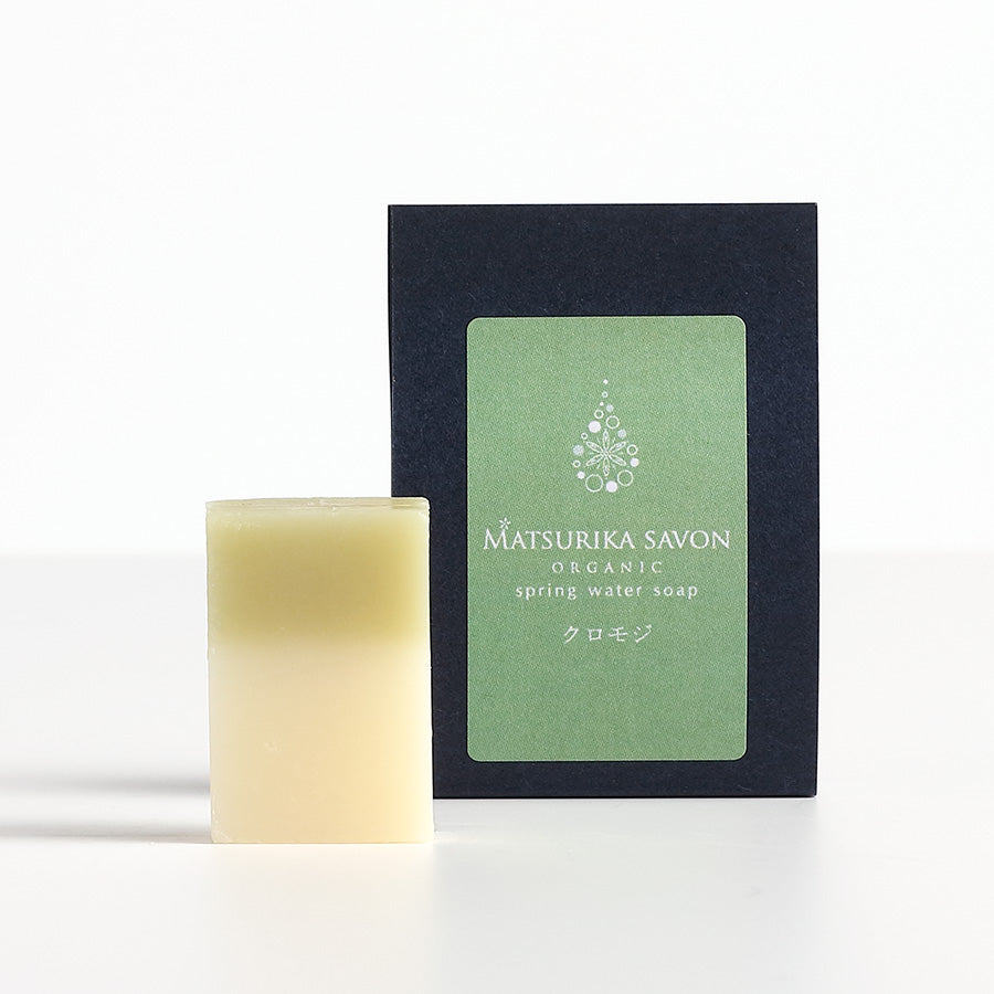 | 素材 | オリーブオイル*、ココナッツオイル*、クロモジ葉/枝水*、水、水酸化ナトリウム、米ぬかオイル、シアバター*、ココアバター*、ひまし油*、マカダミアナッツオイル*、ホーリーフ精油、クロモジ精油*、ゼラニウム精油、オレンジスイート精油 (*はオーガニック認証または野生種の原材料) |